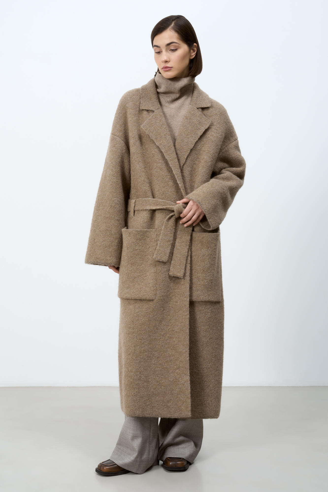 Knitted wool-blend wrap coat with matching belt. Loose silhouette model with dropped shoulders and patch pockets. Turn-down collar with square lapels. The product is unlined. You can complement the look with a matching scarf and hat.