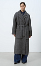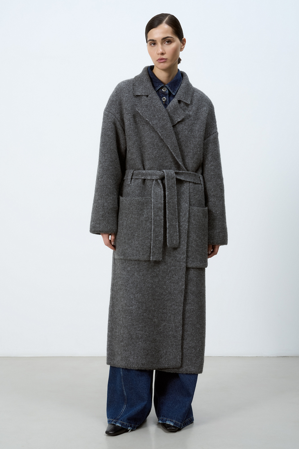 Knitted wool-blend wrap coat with matching belt. Loose silhouette model with dropped shoulders and patch pockets. Turn-down collar with square lapels. The product is unlined. You can complement the look with a matching scarf and hat.