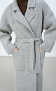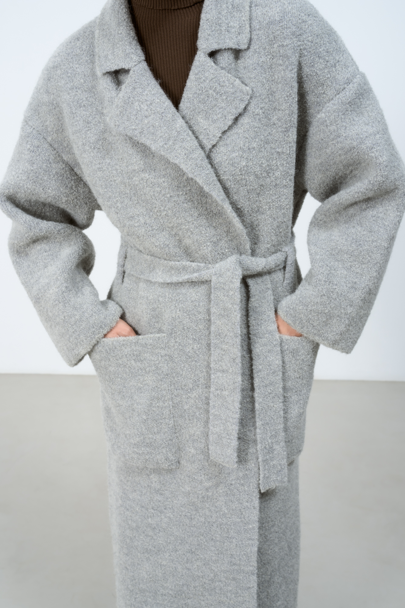 Knitted wool-blend wrap coat with matching belt. Loose silhouette model with dropped shoulders and patch pockets. Turn-down collar with square lapels. The product is unlined. You can complement the look with a matching scarf and hat.