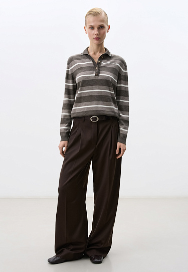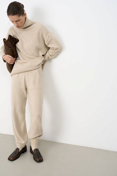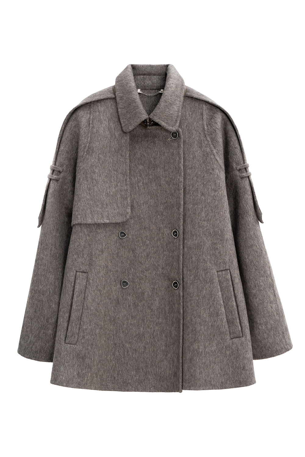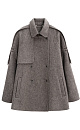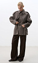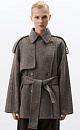 Double-breasted coat with added camel hair. The model has a straight, loose silhouette with a turn-down collar and side pockets. The item is decorated with a flying yoke and wide lapels on the shoulders. At the waist there are belt loops through which a belt made of the same material as the coat is threaded. No lining.