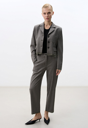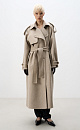 A long double-breasted wool coat with camel wool added. The model has a straight, loose silhouette with a turn-down collar and side pockets. The coat is decorated with a flying yoke and wide lapels on the shoulders. There are shoulder straps on the waist, through which a belt made of the same material as the coat is worn. The coat is unlined.