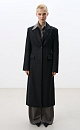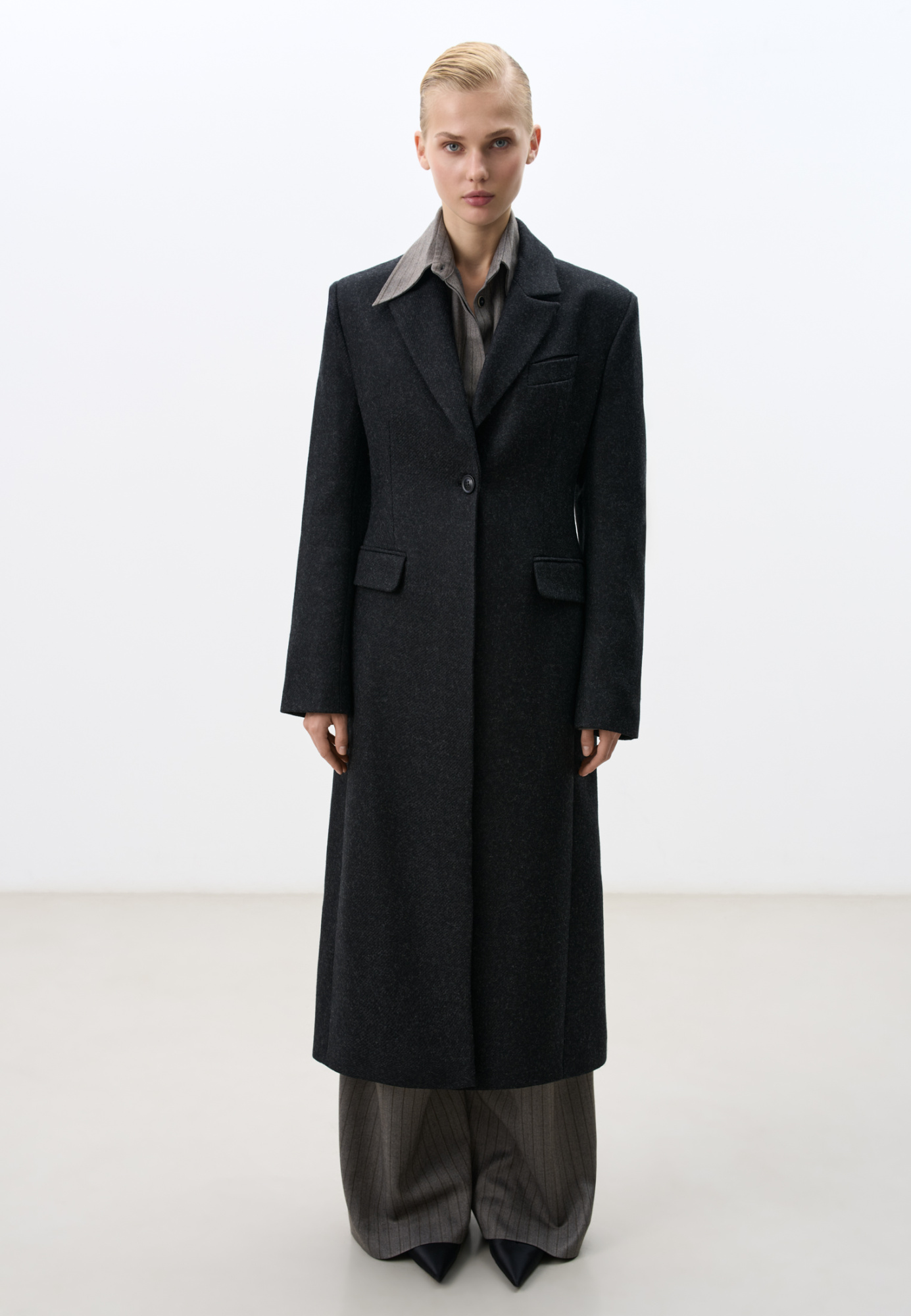 Classic single-breasted wool coat. The model has a fitted silhouette with wide lapels and pockets with flaps. The product is lined. Button closure.