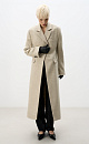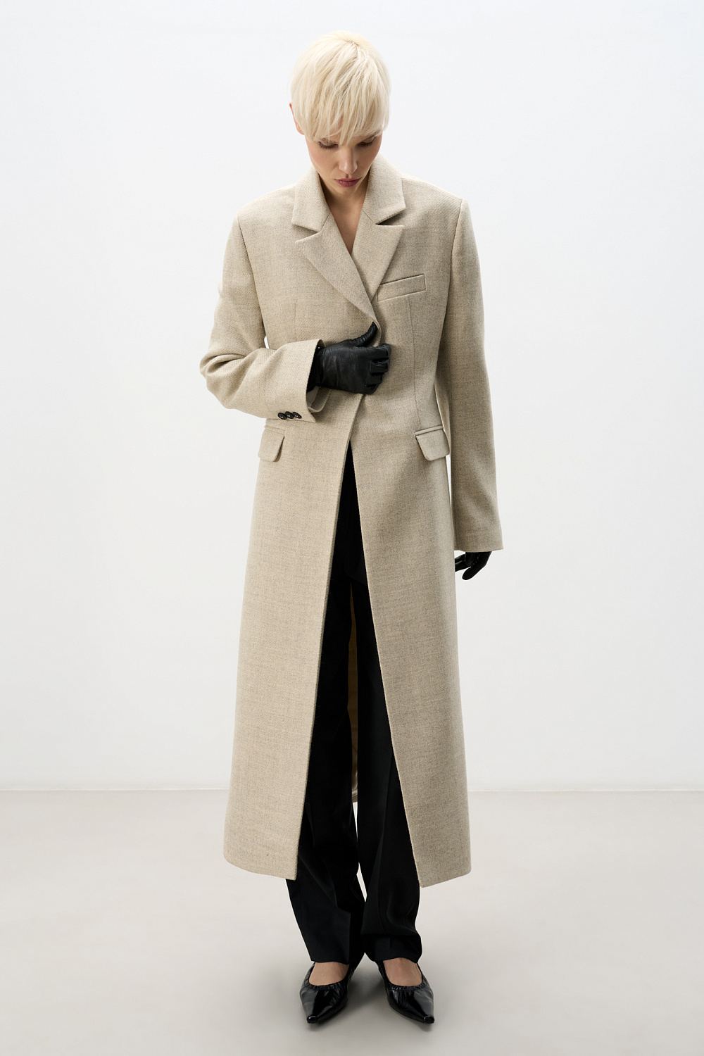 Classic single-breasted wool coat. The model has a fitted silhouette with wide lapels and pockets with flaps. The product is lined. Button closure.