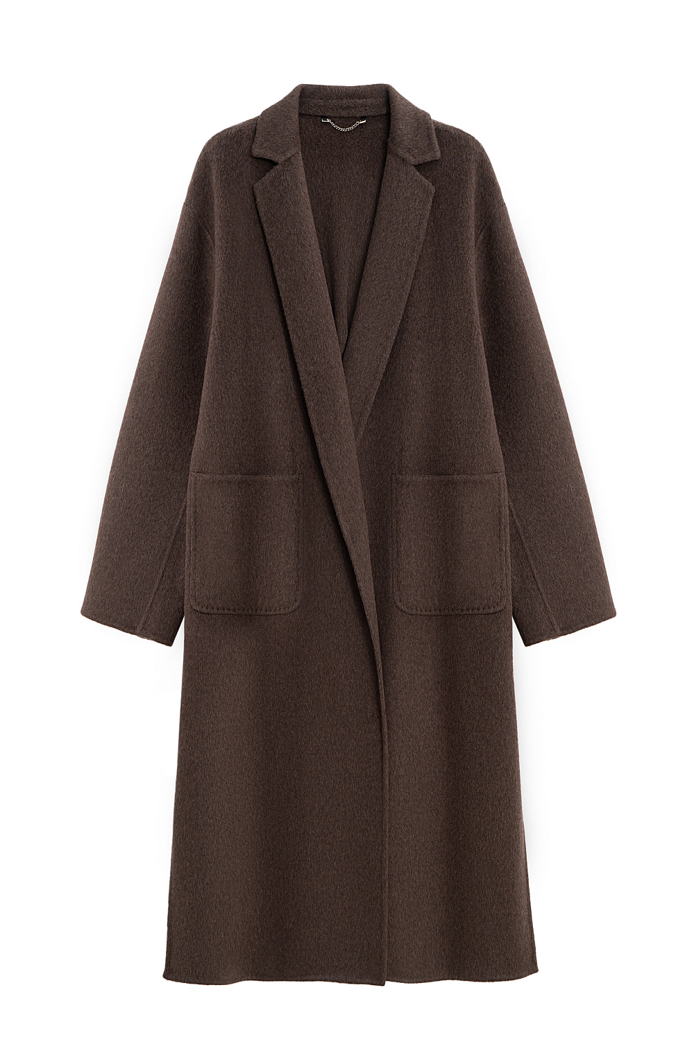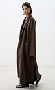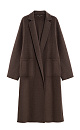 A classic long coat made of wool and cashmere. It has a straight cut, narrow lapels, deep patch pockets, and high side slits. The coat comes with a belt.