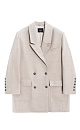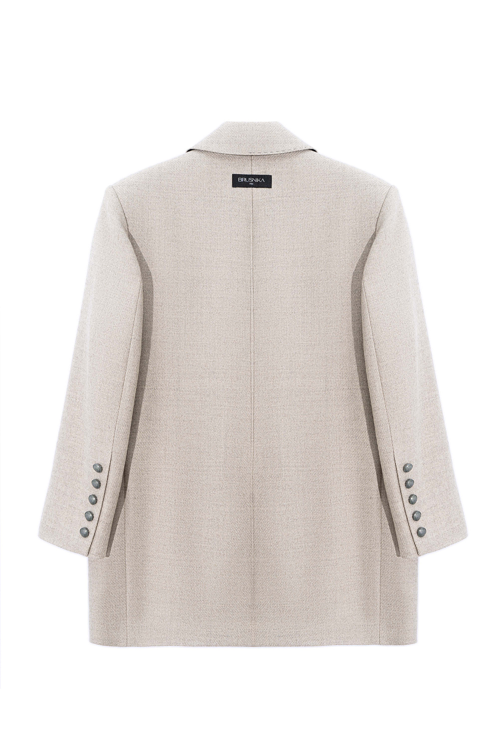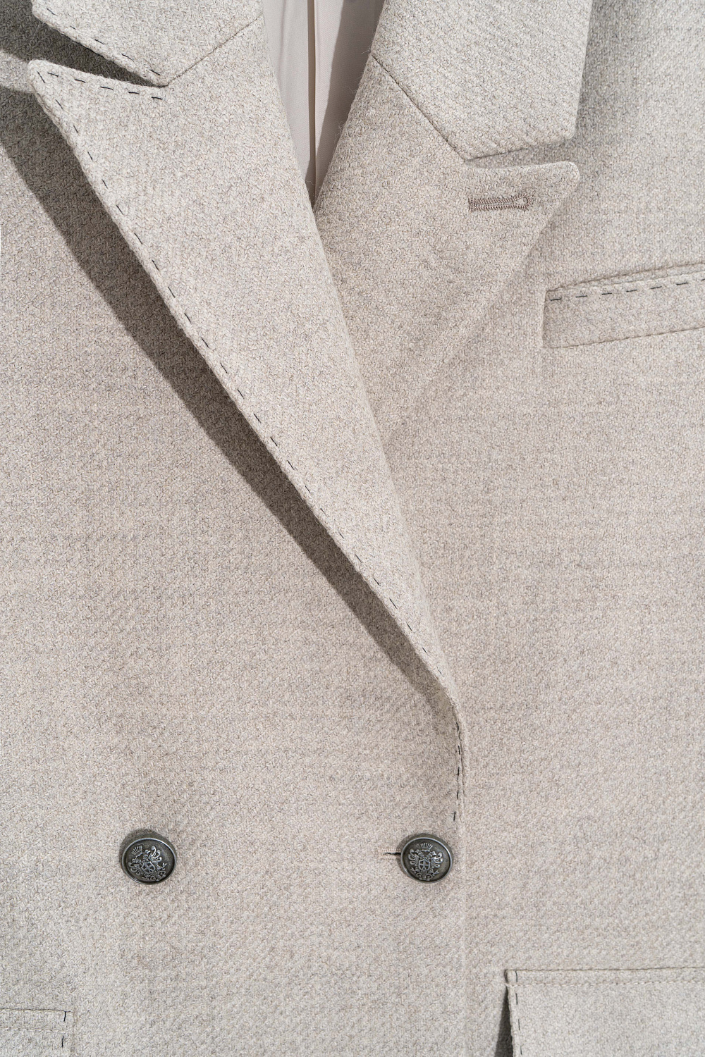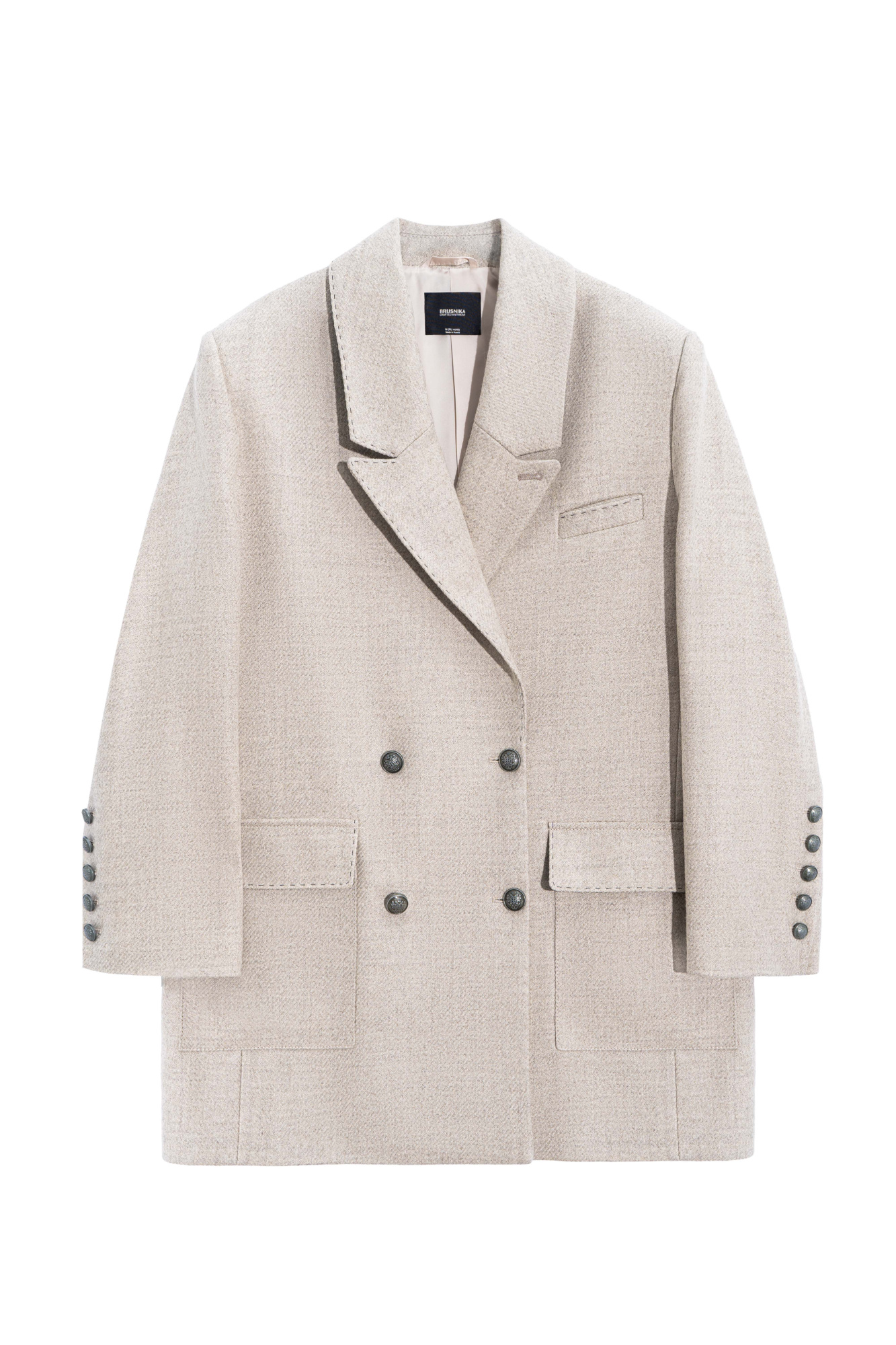 Short double-breasted wool coat. Straight fit model with wide lapels, side pockets with flaps and chest pockets. The edges of the lapel and pockets are decorated with stitching imitating a hand tie.