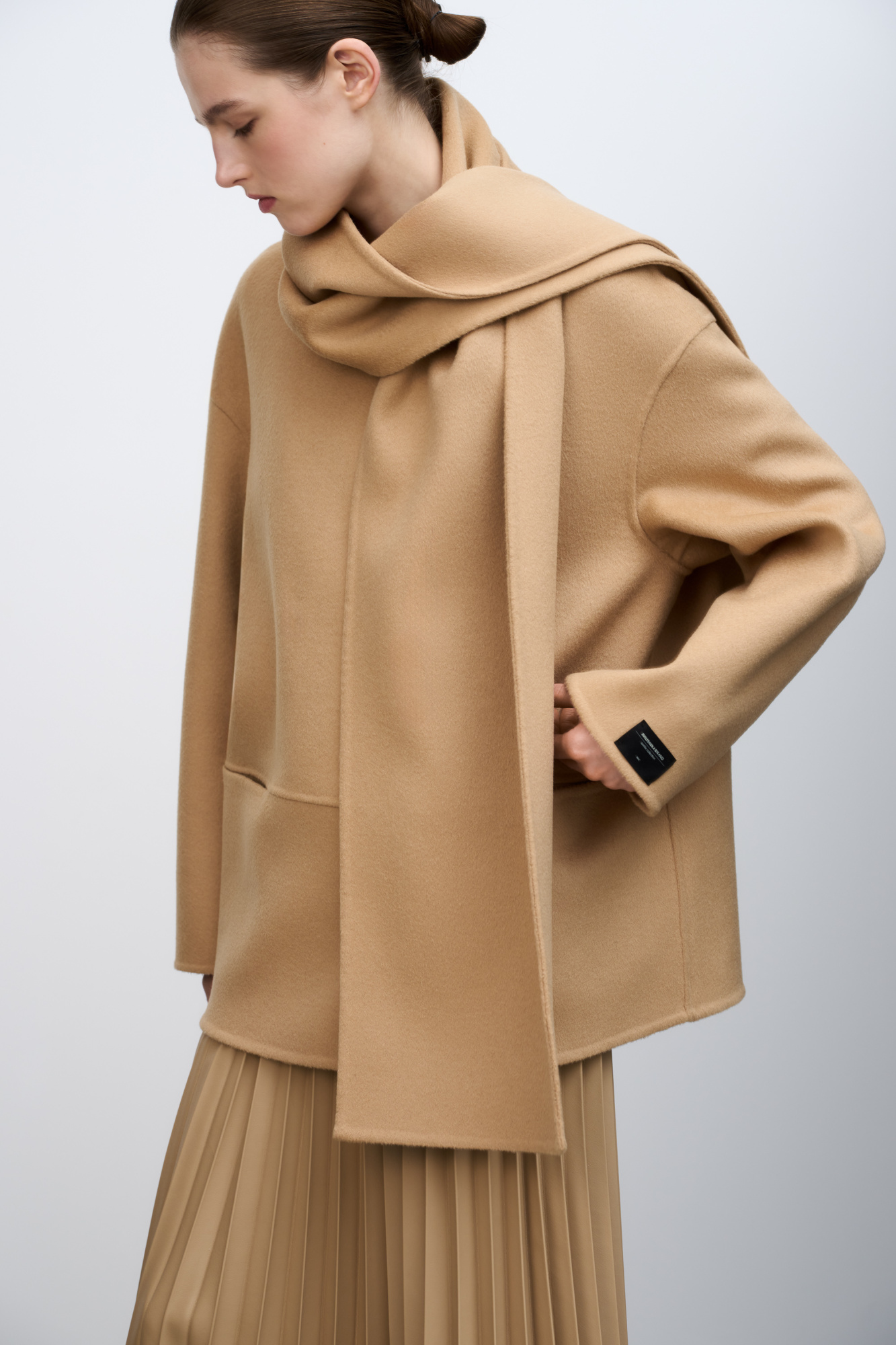 Double-breasted coat in soft wool fabric. Features loose silhouette and welt pockets. Hidden snap closure, logo on the sleeve and scarf collar.
