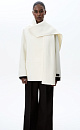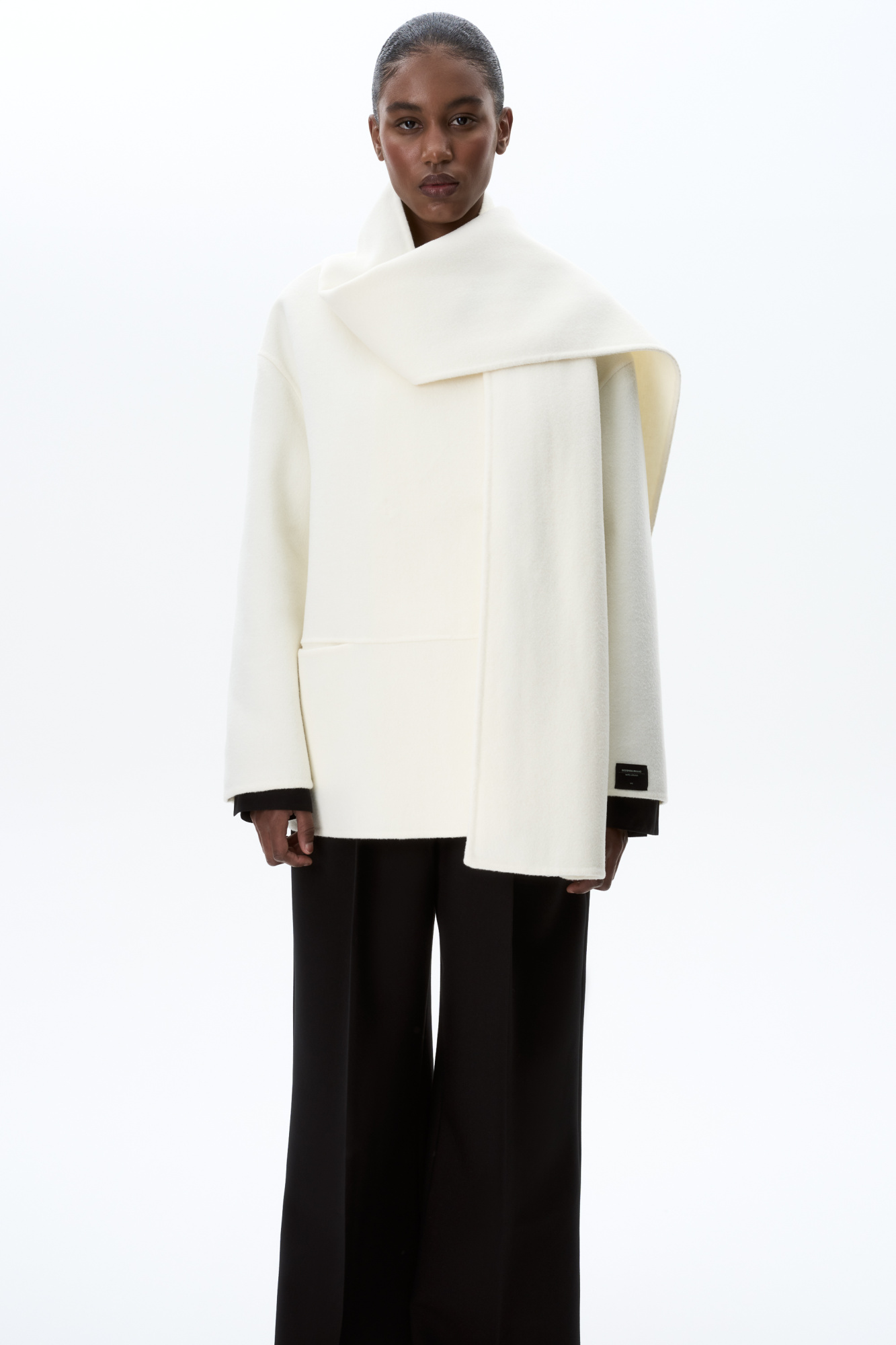 Double-breasted coat in soft wool fabric. Features loose silhouette and welt pockets. Hidden snap closure, logo on the sleeve and scarf collar.