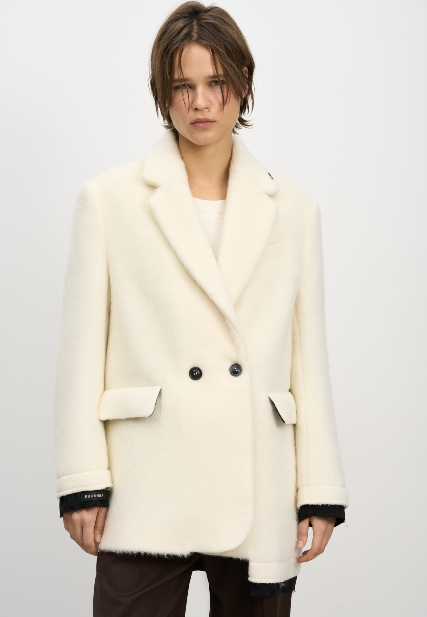 Single-breasted wool jacket. Loose silhouette with front pockets. Lined.