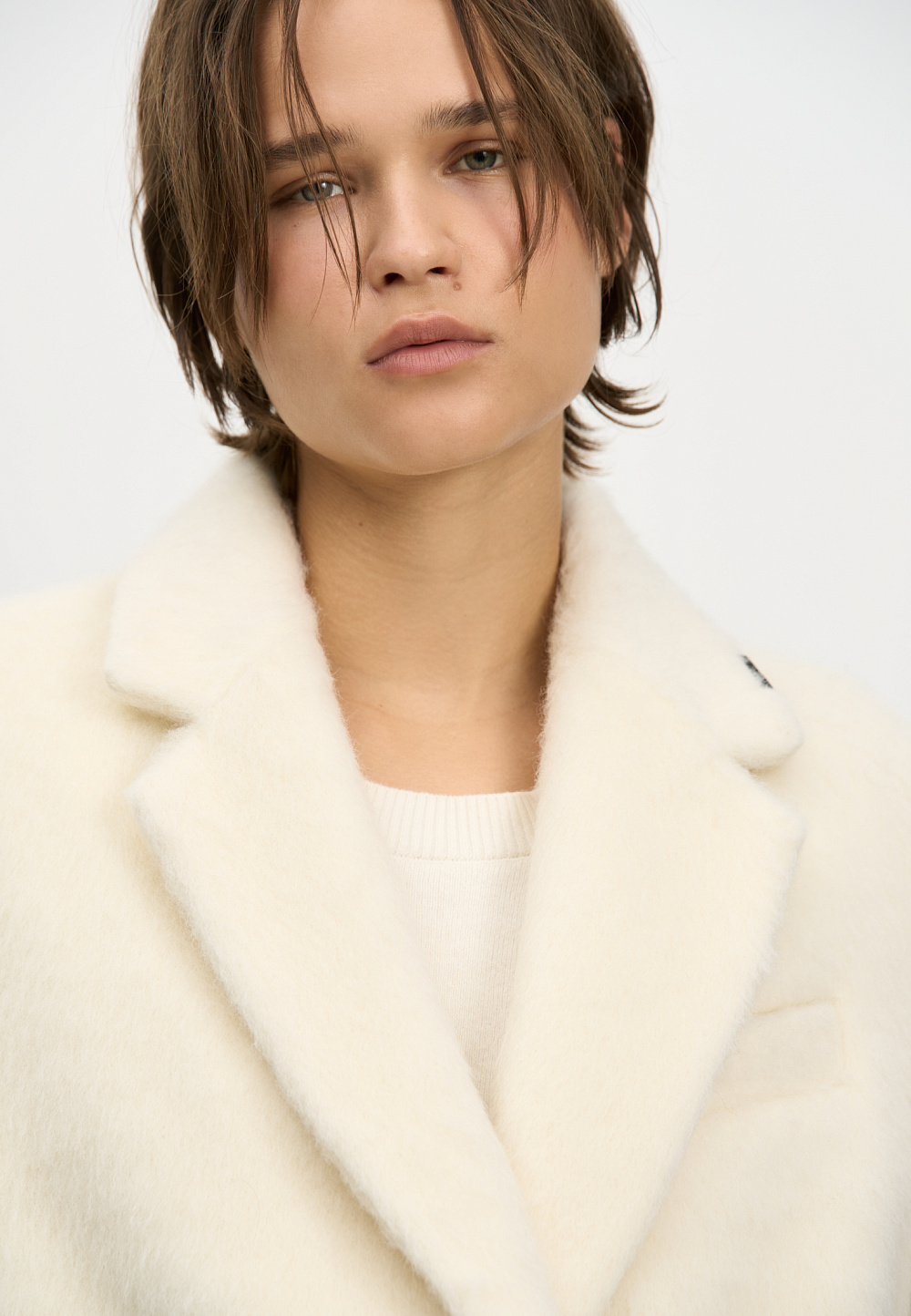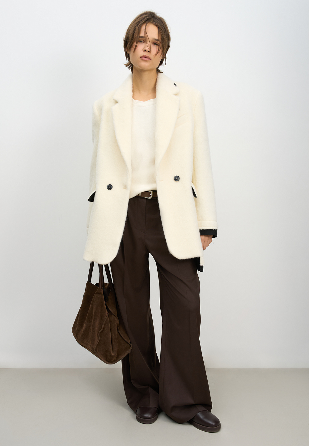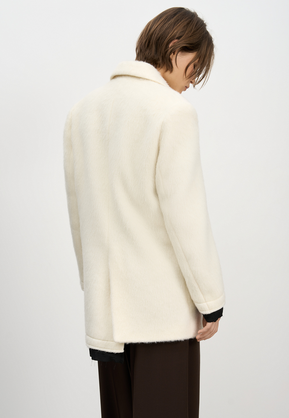 Single-breasted wool jacket. Loose silhouette with front pockets. Lined.