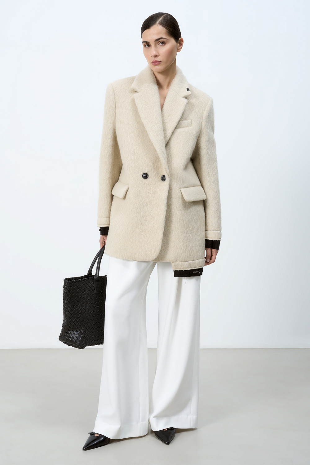 Single-breasted wool jacket. Loose silhouette with front pockets. Lined.