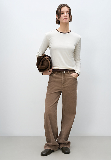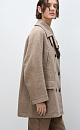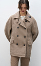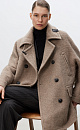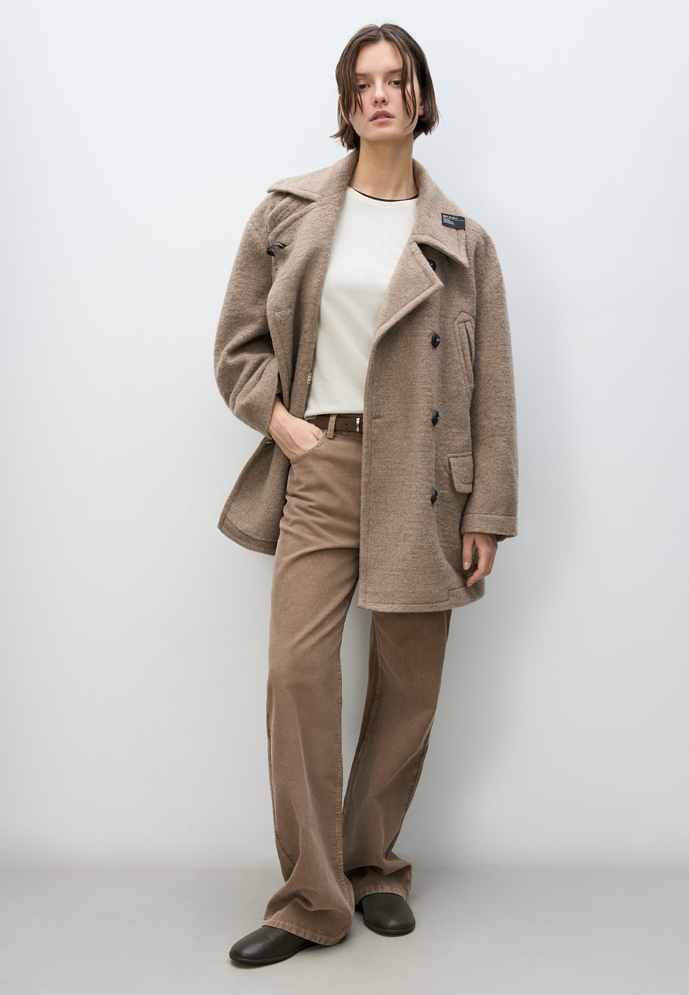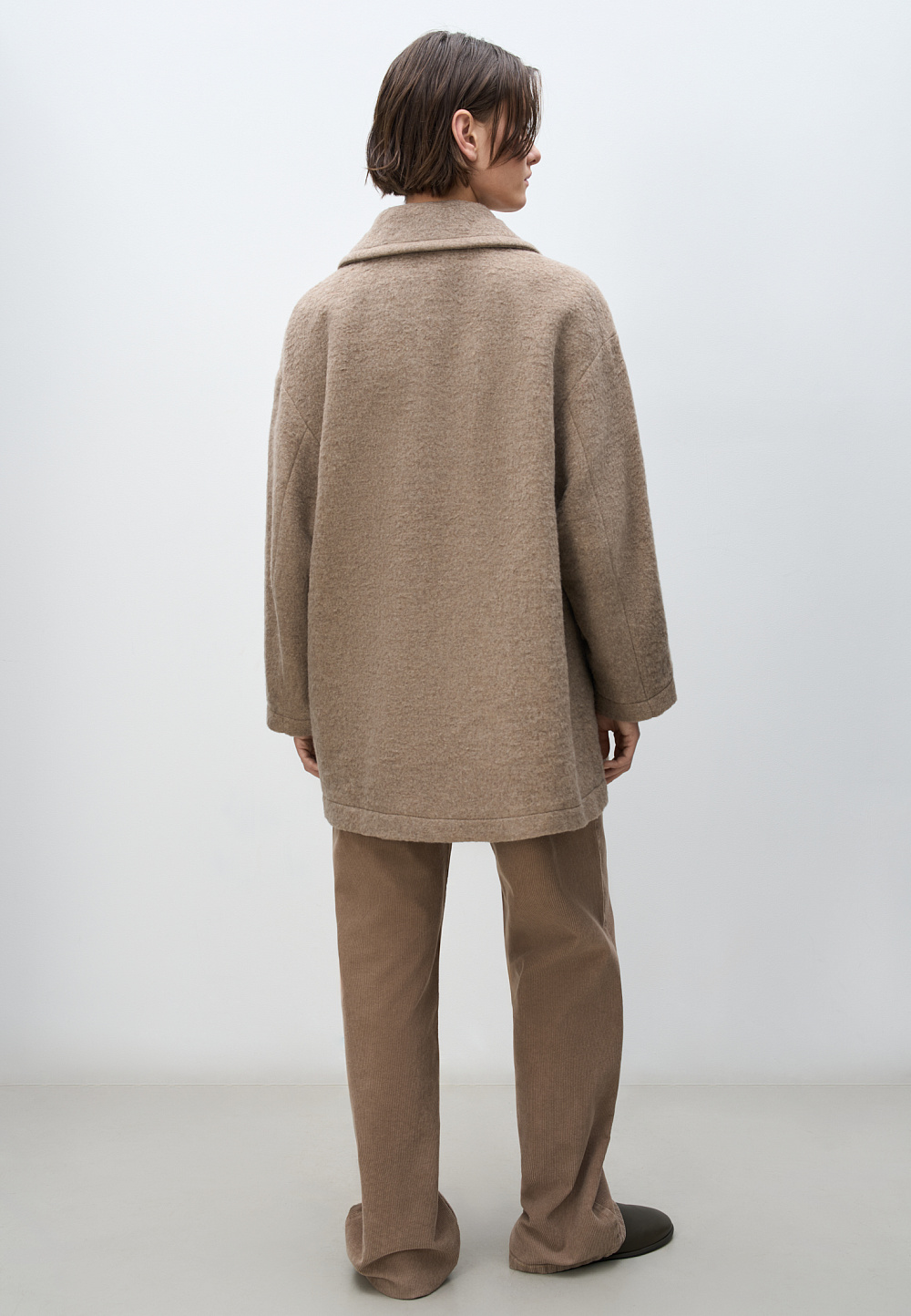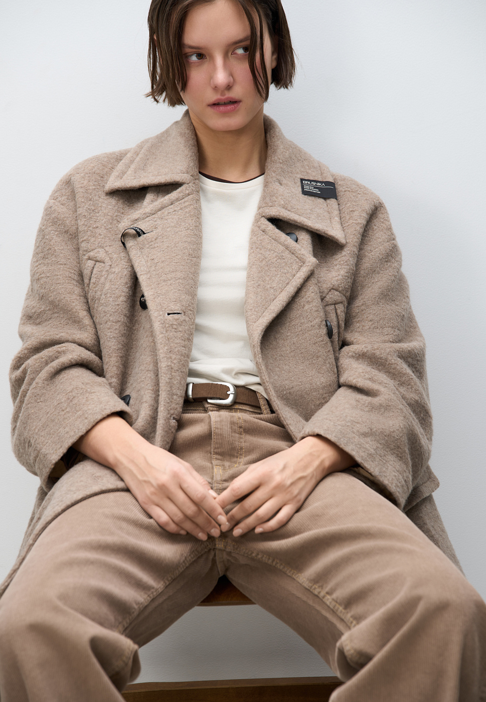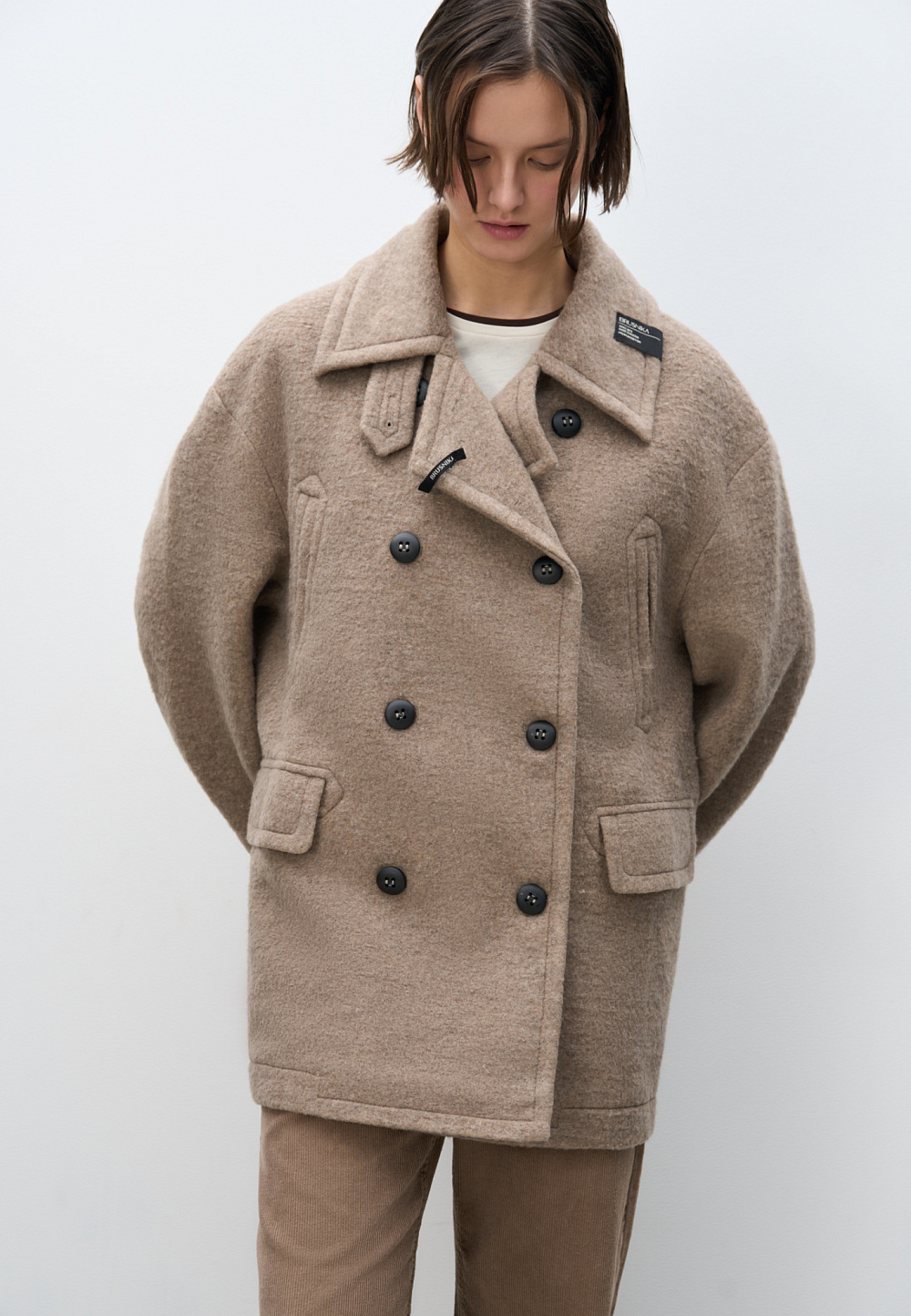 Double-breasted coat in wool blend. The model has a loose silhouette with dropped shoulders, side pockets on the chest and patch pockets on the front. Button fastening, branded label on the collar. Lined.