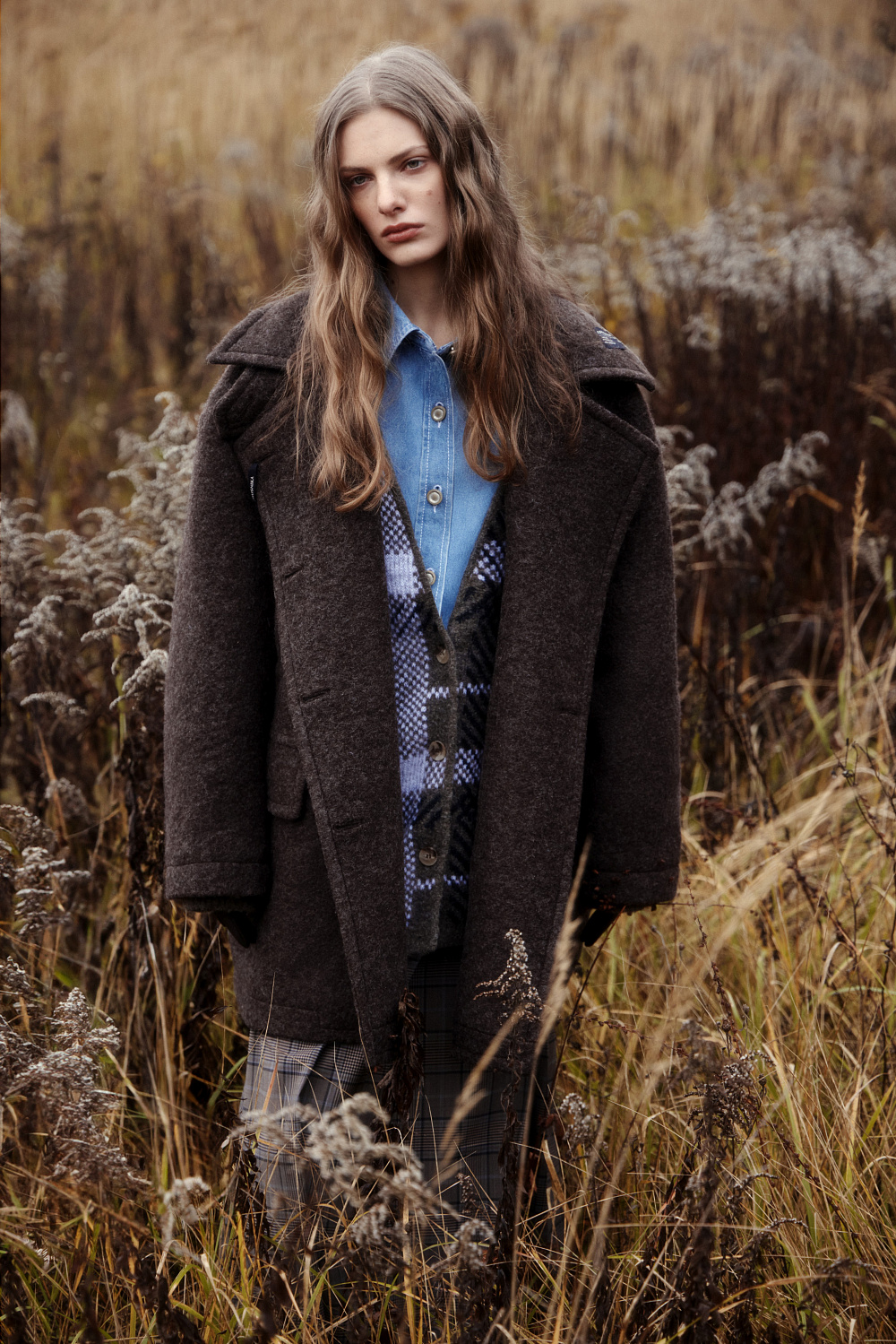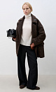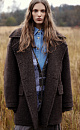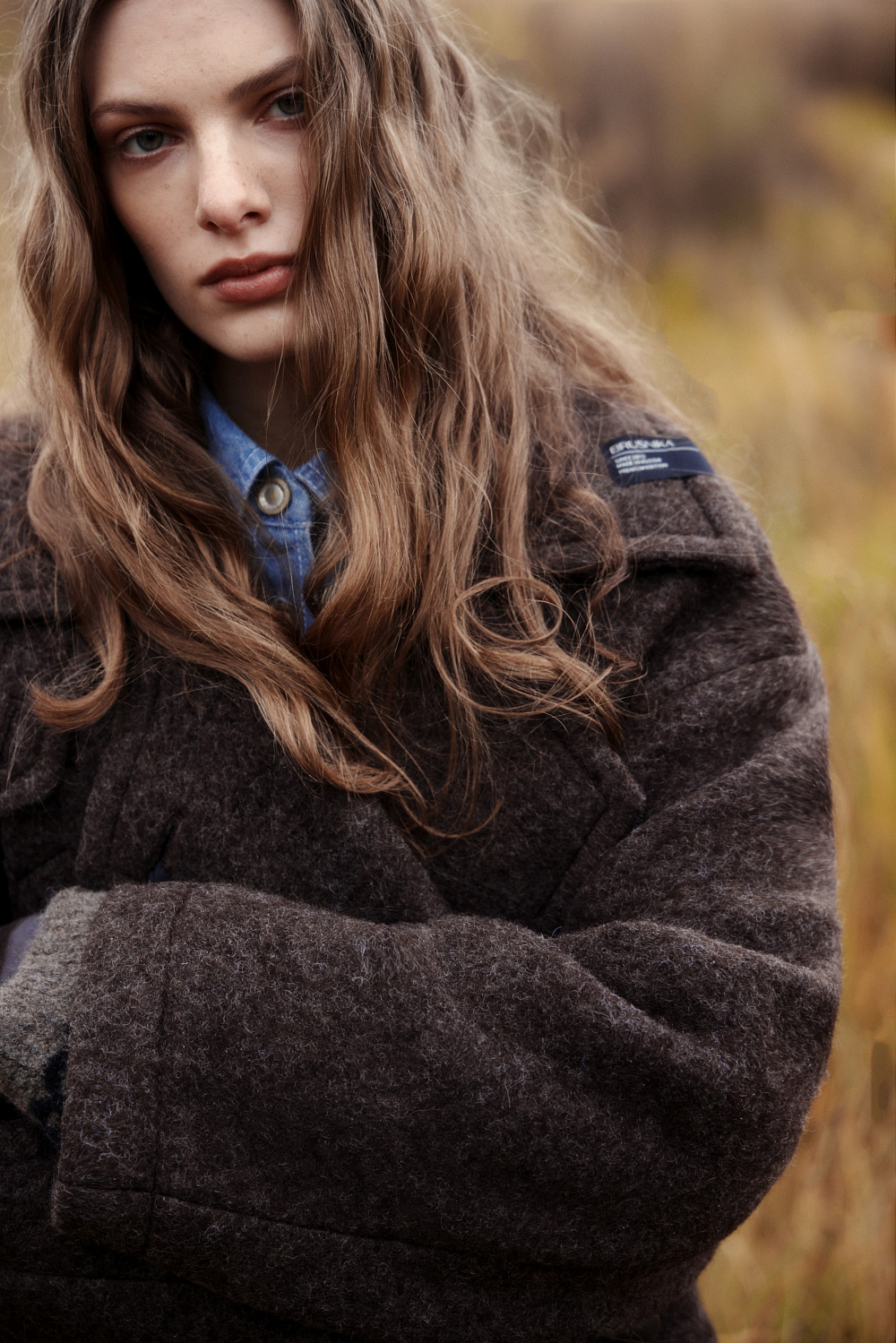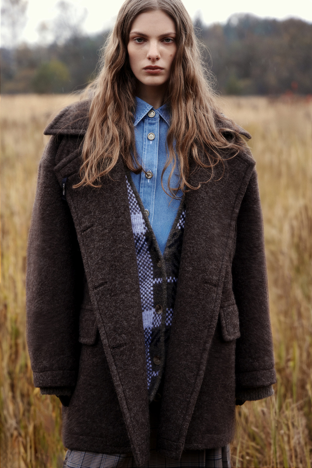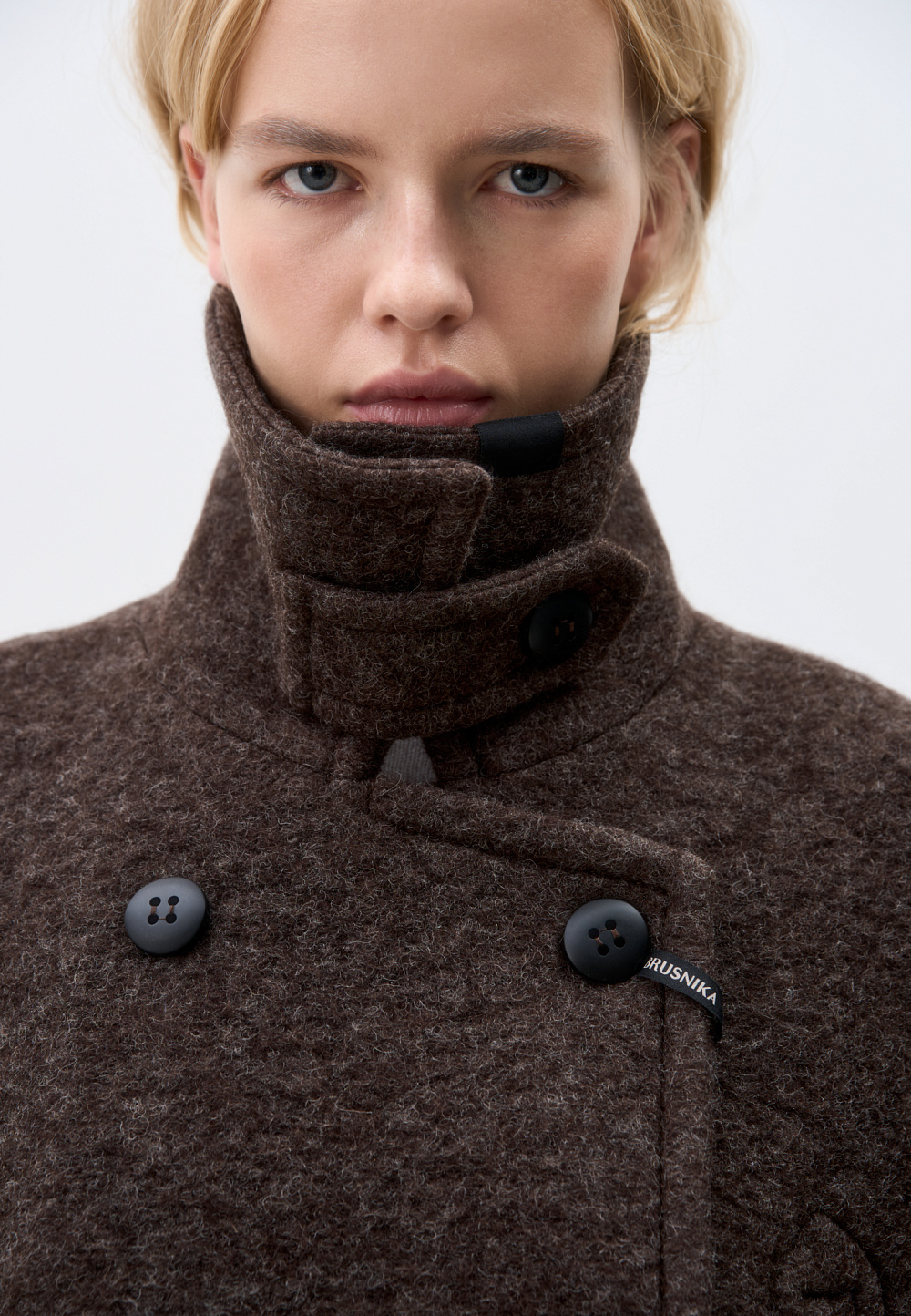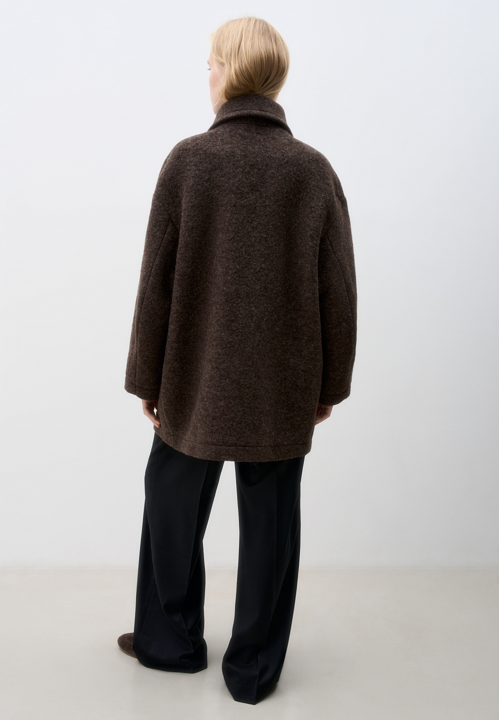 Double-breasted coat in wool blend. The model has a loose silhouette with dropped shoulders, side pockets on the chest and patch pockets on the front. Button fastening, branded label on the collar. Lined.