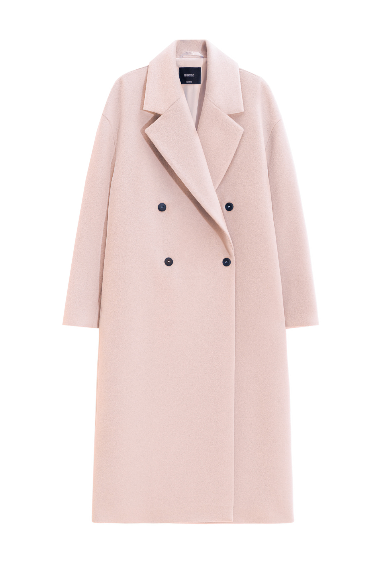 Double-breasted long wool coat. Straight cut model with wide lapels and slit pockets. The product is lined.