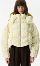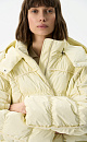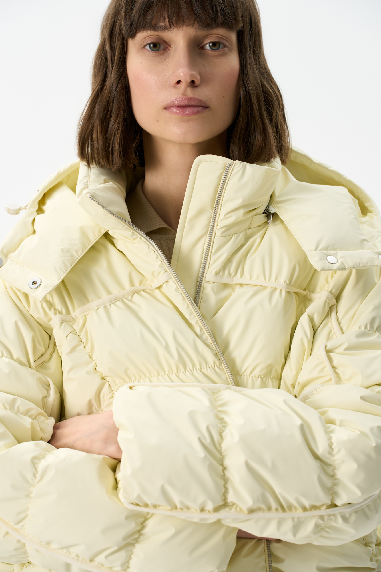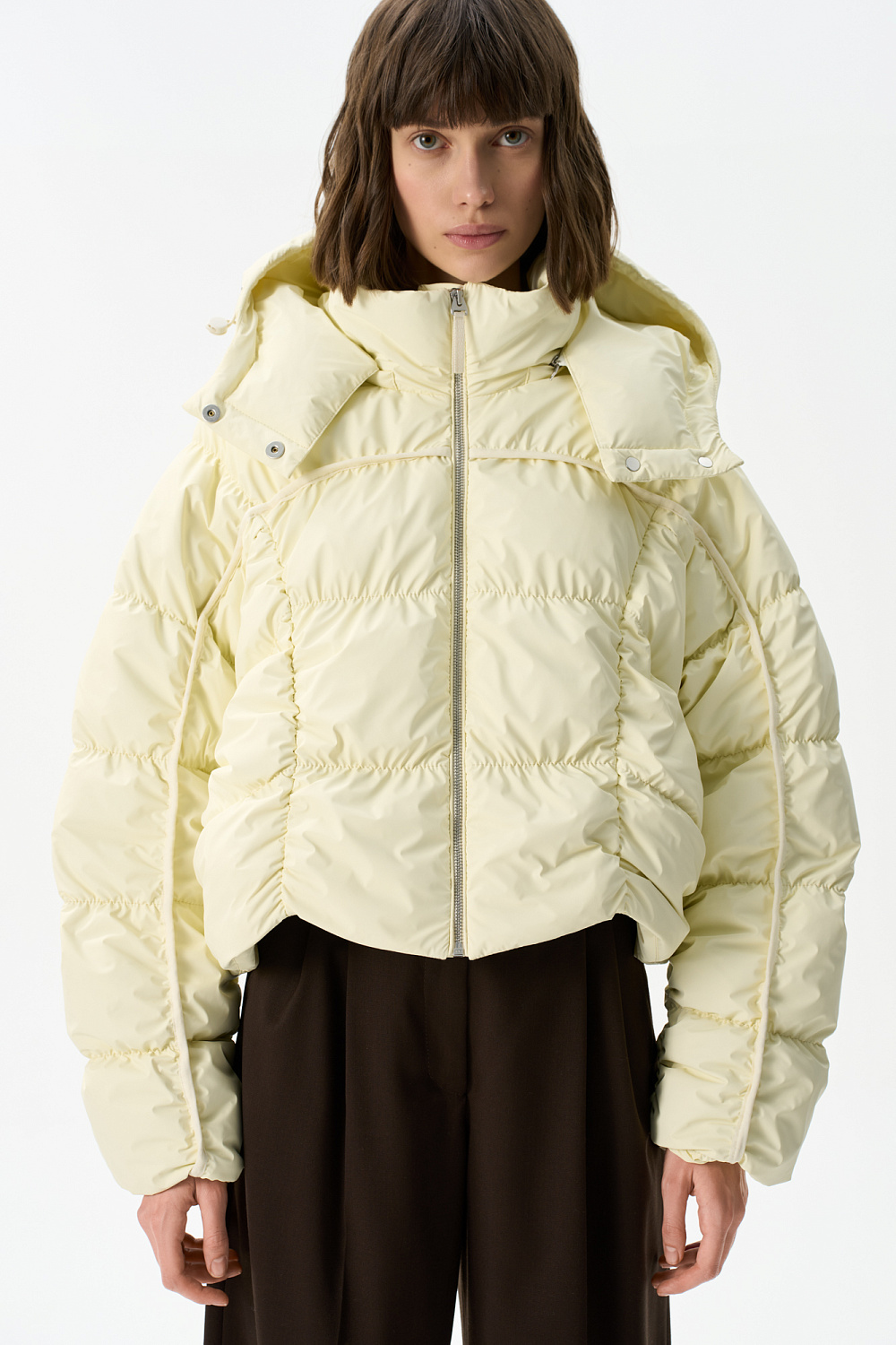 Voluminous down jacket with geometric stitching and voluminous seams. The product has a hood with a drawstring and a stand-up collar.