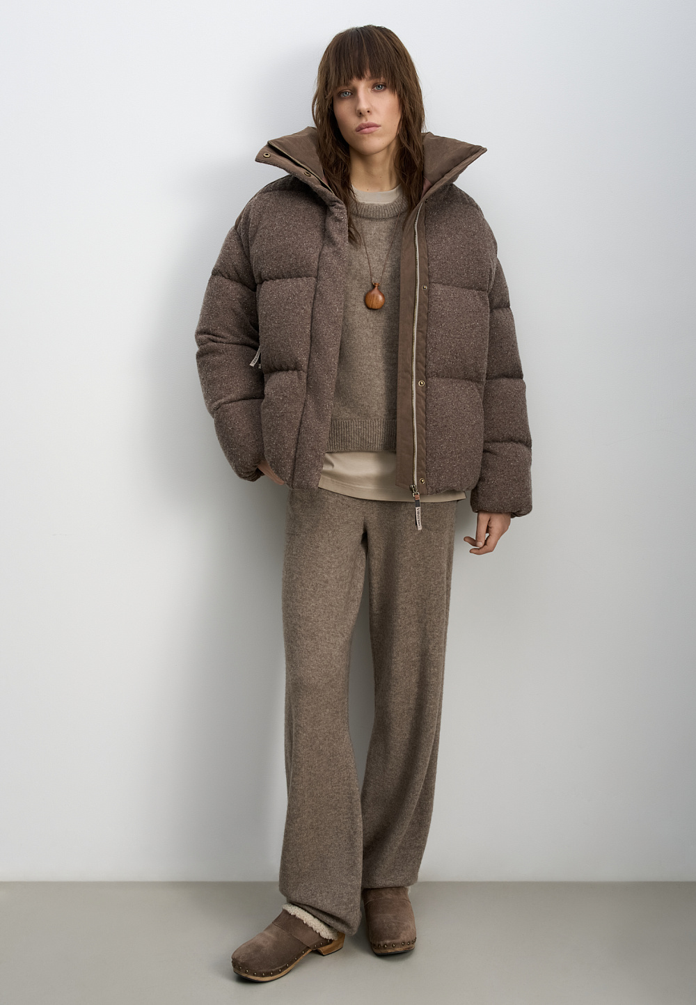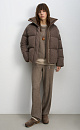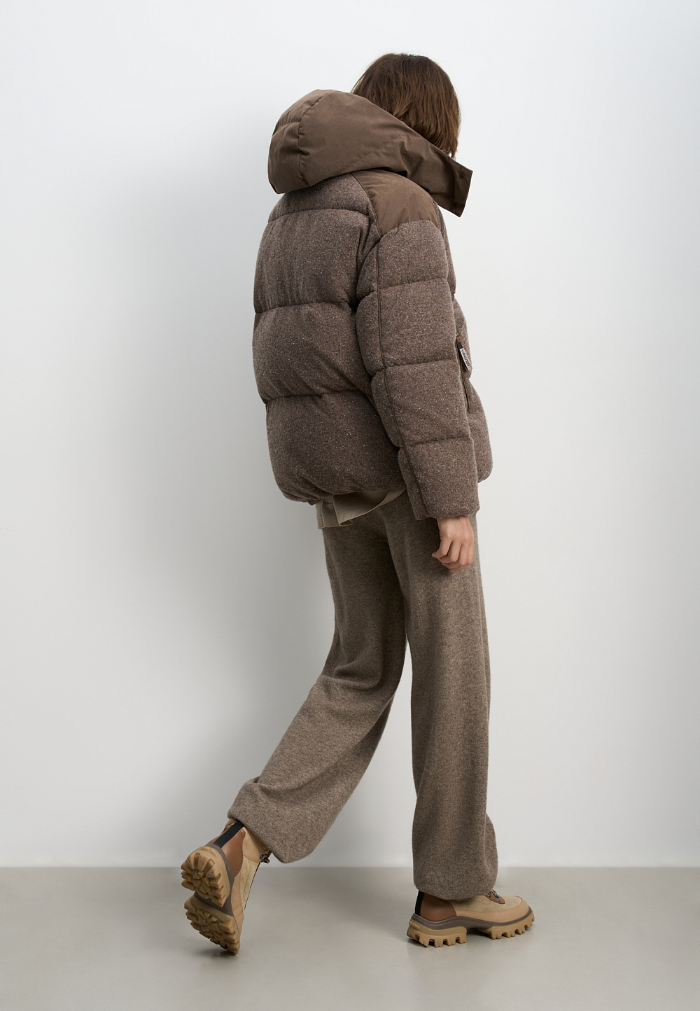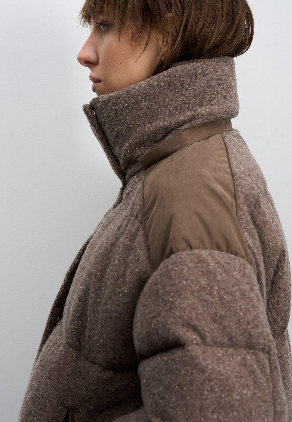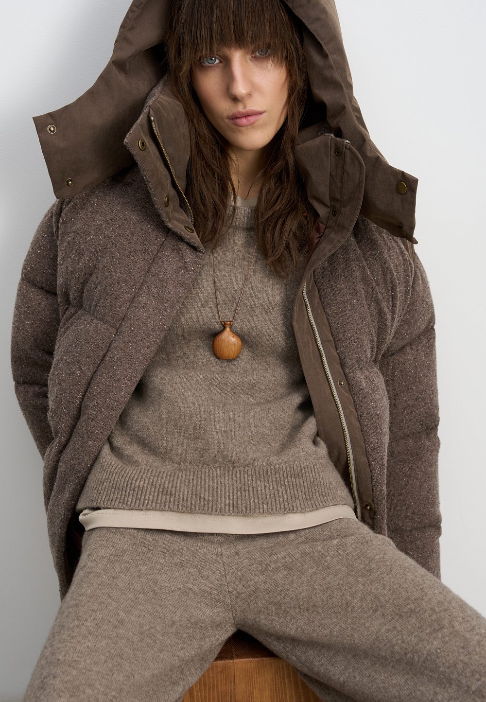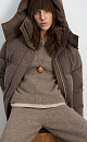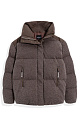 A knitted down jacket made of wool with added viscose and silk, filled with down. A free-fit model with a stand-up collar, hood, and zippered pockets. Zipper closure under a button placket.