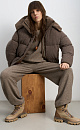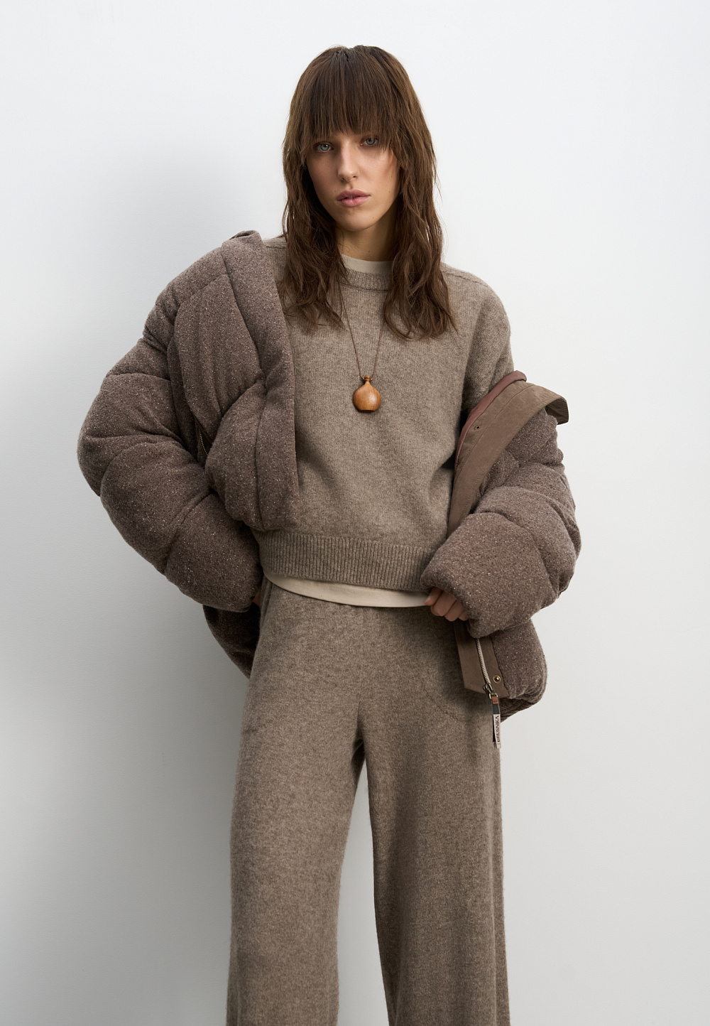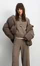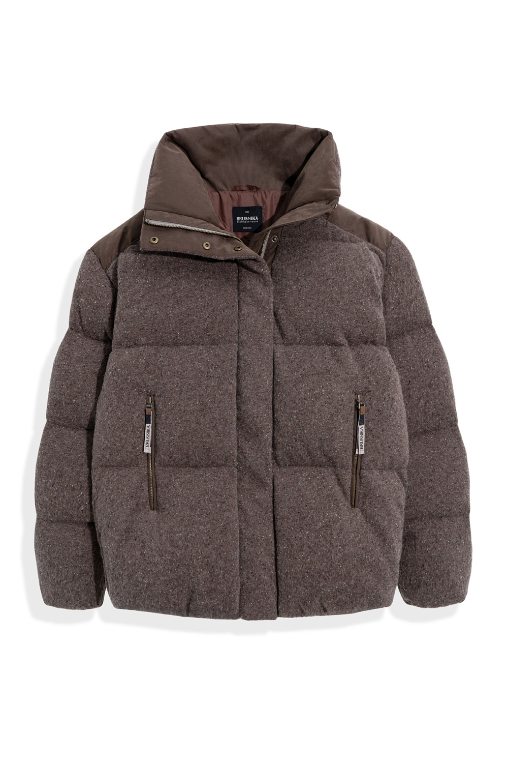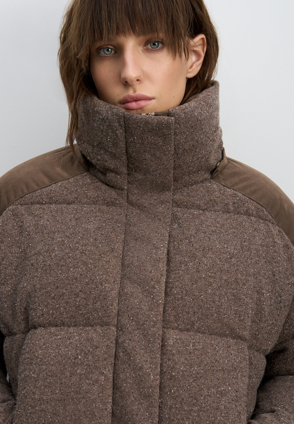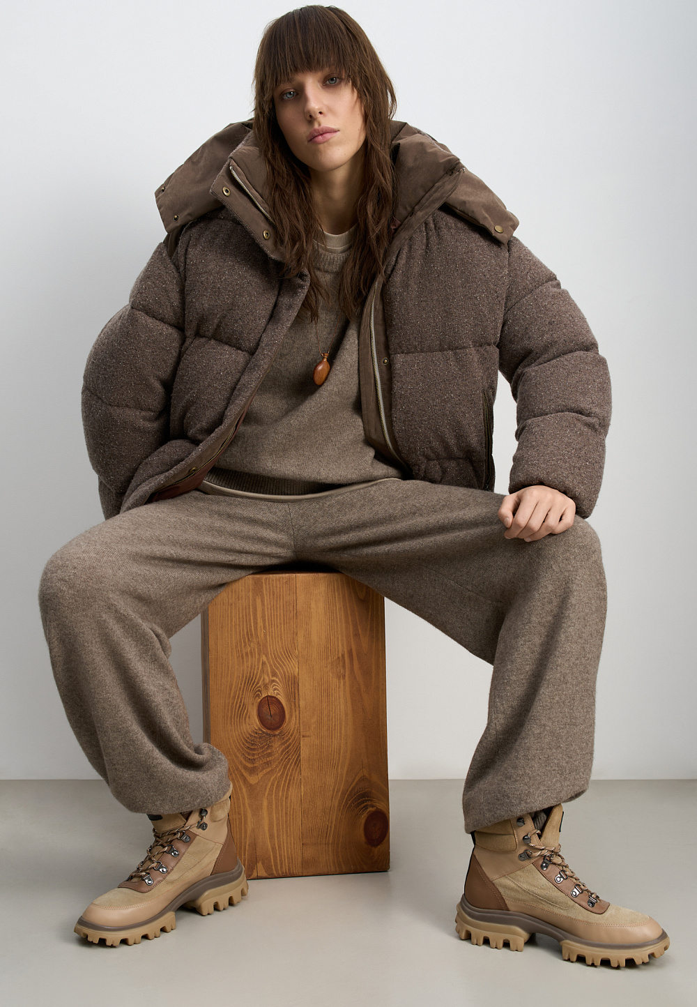A knitted down jacket made of wool with added viscose and silk, filled with down. A free-fit model with a stand-up collar, hood, and zippered pockets. Zipper closure under a button placket.