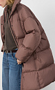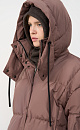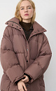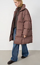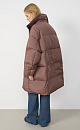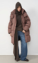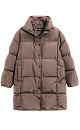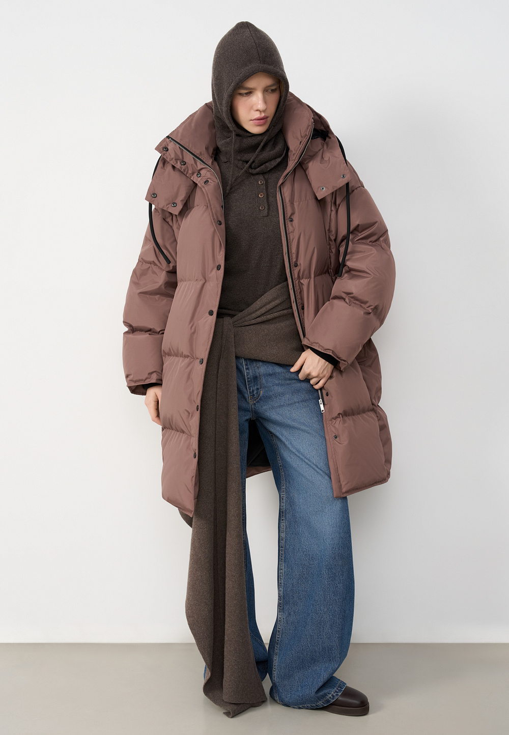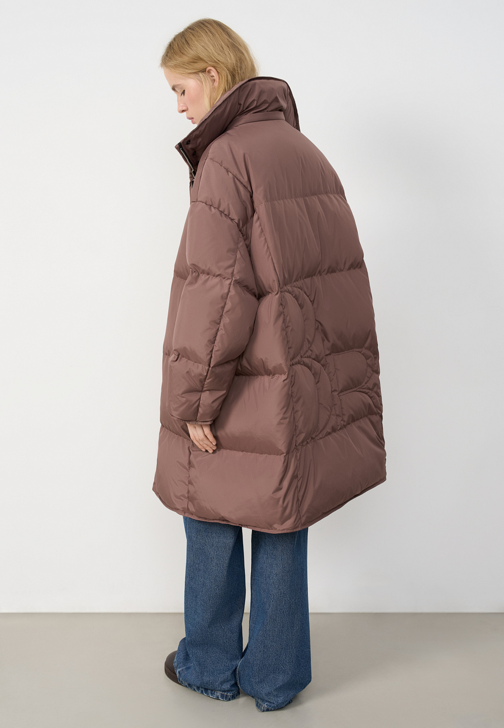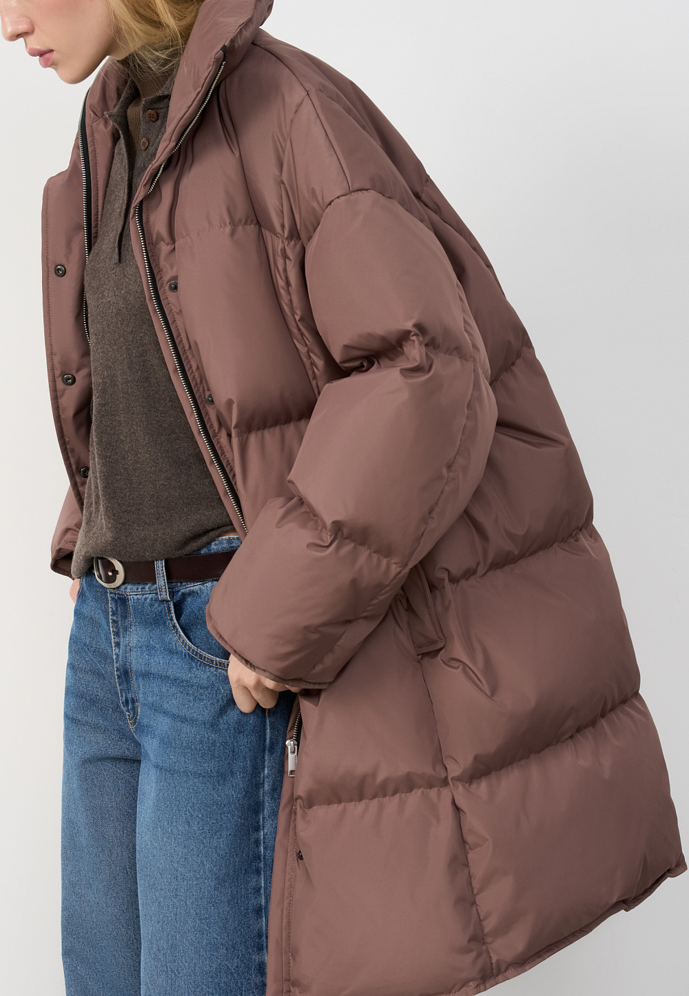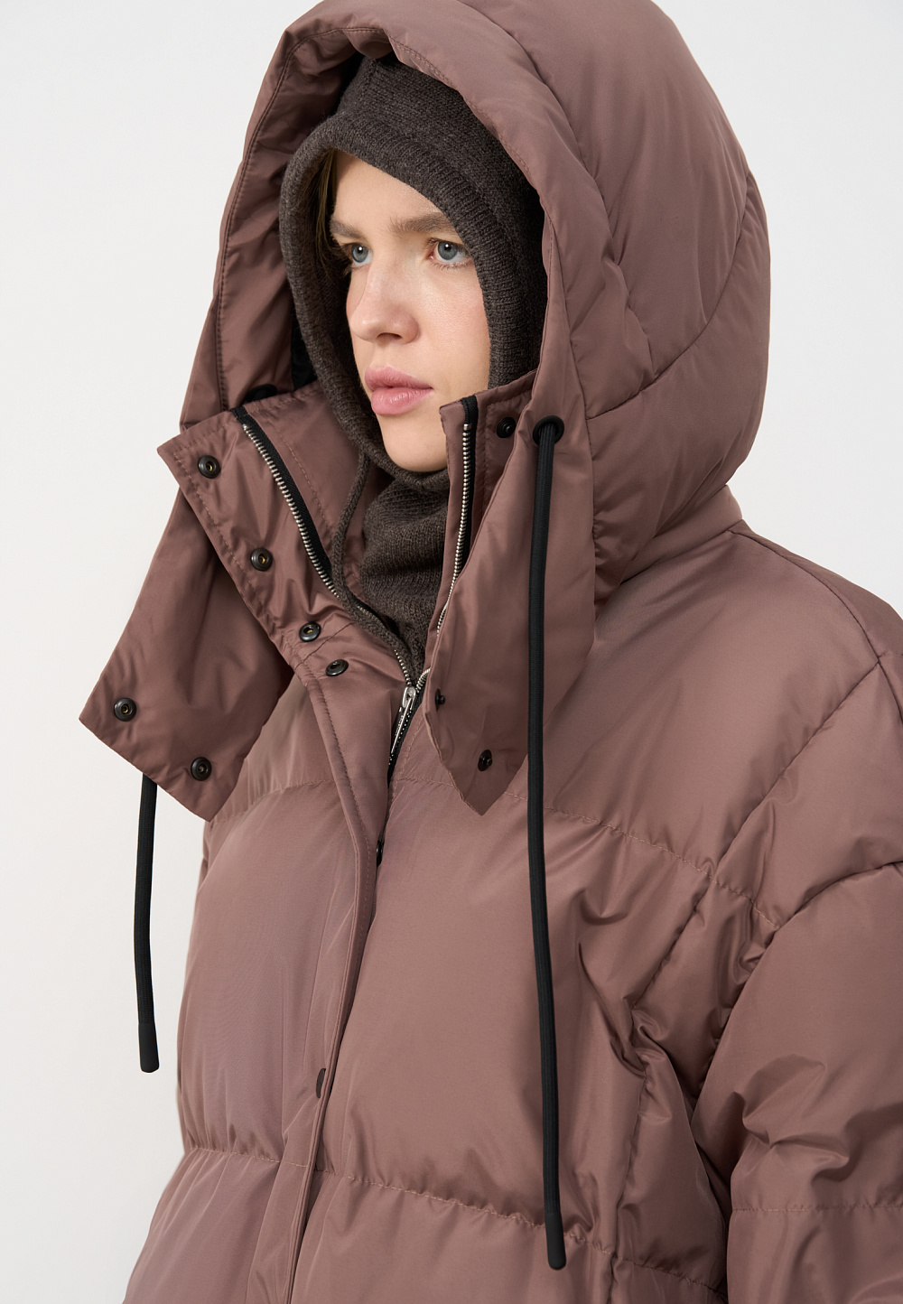 Long quilted down jacket with drawstring hood. Loose-fitting model with stand collar, knitted cuffs and side pockets. Zipper closure under the placket with branded buttons.