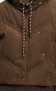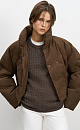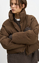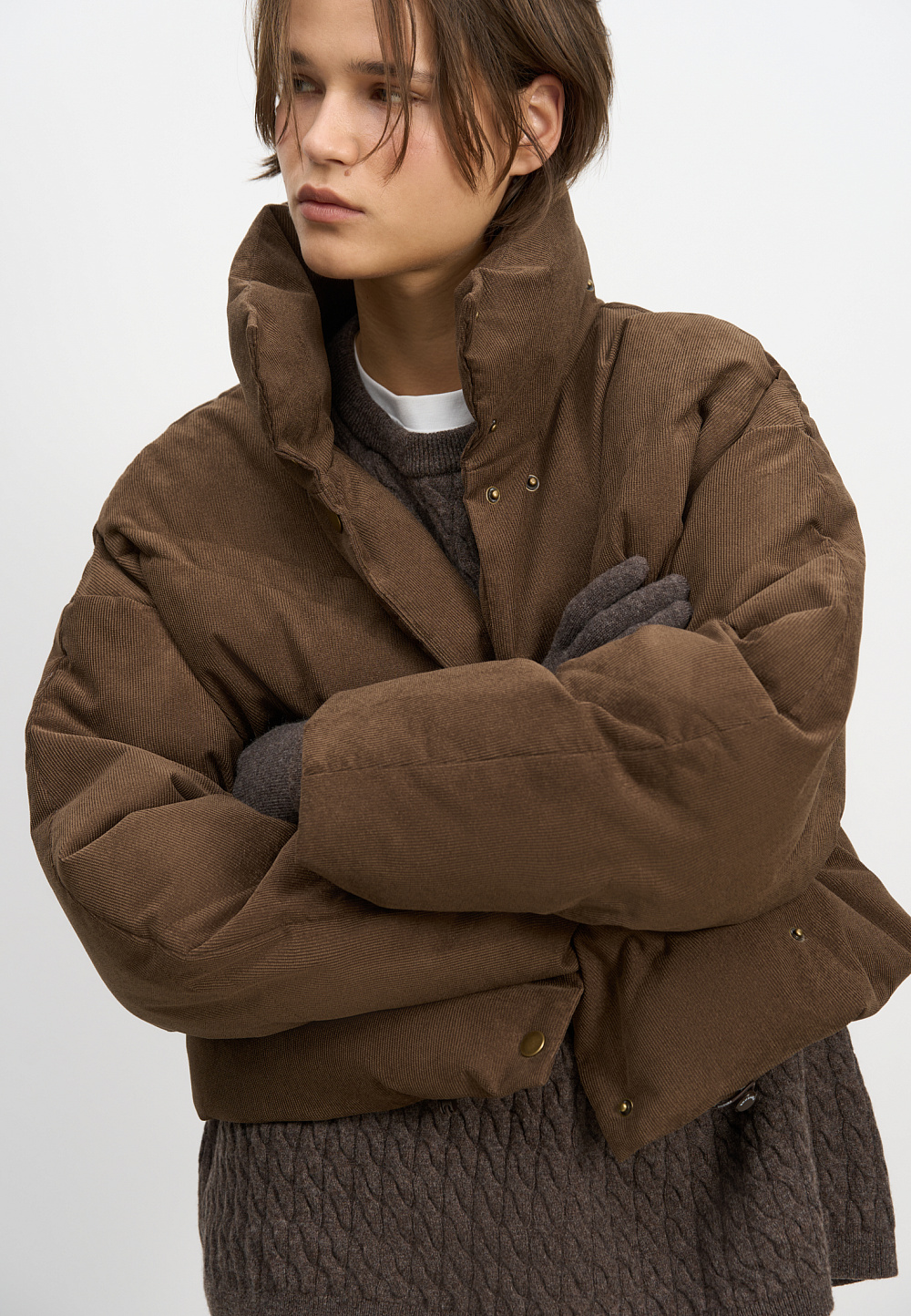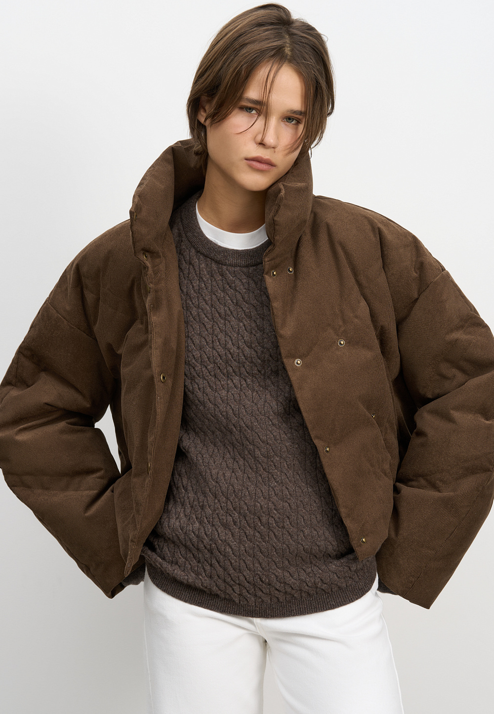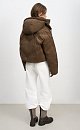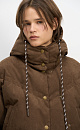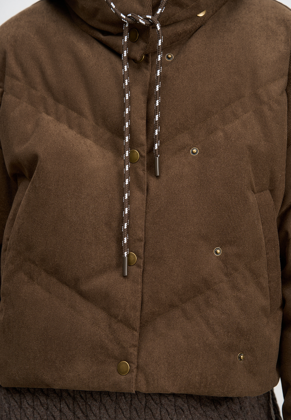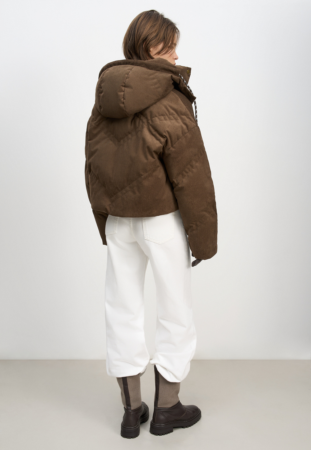 Down jacket with a stand-up collar, removable hood and graphic double stitching. The model has two clasp options with metal buttons. The bottom of the product is made on a drawstring.