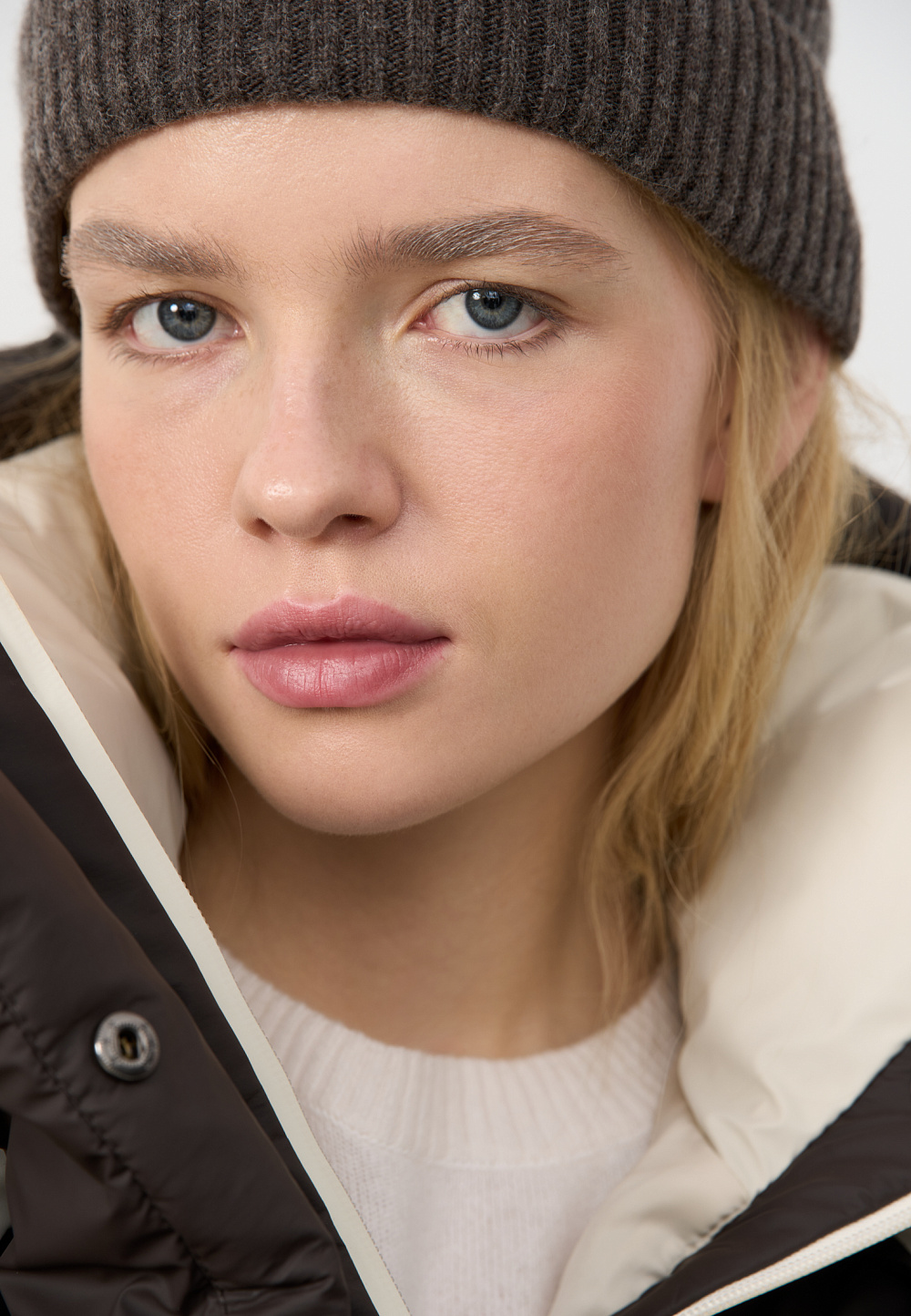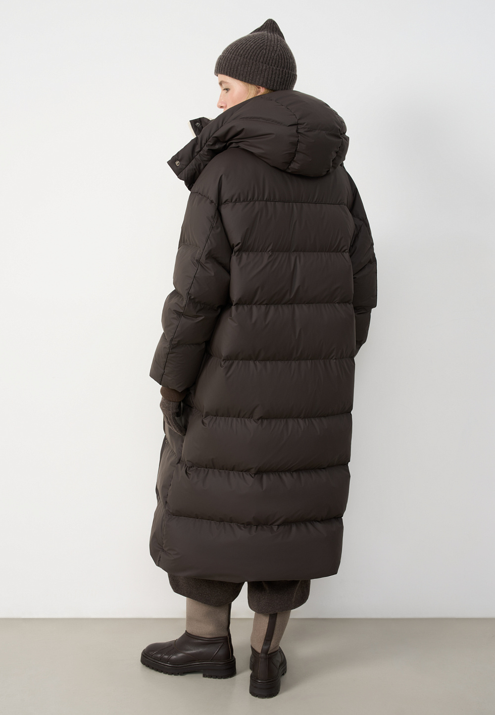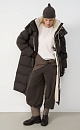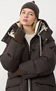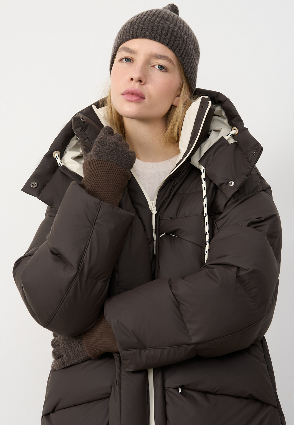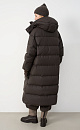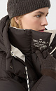 Voluminous long down jacket. Model with a stand-up collar, a hood with a drawstring and buttons, large chest and side pockets with zippers and flaps and wide ribbed knitted cuffs. Full-length zip fastening under snap placket. The collar of the product is decorated with the brand logo.