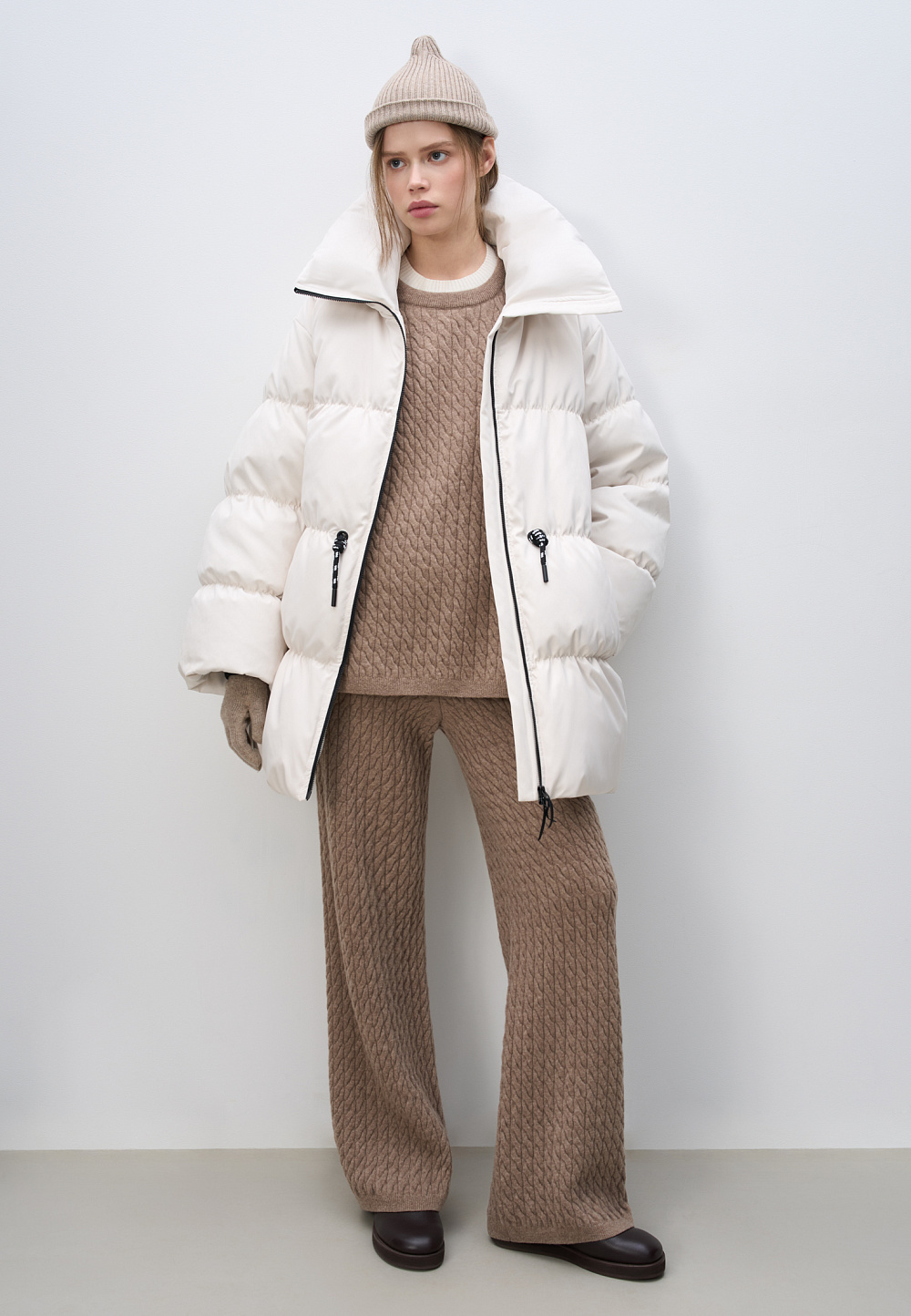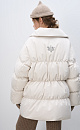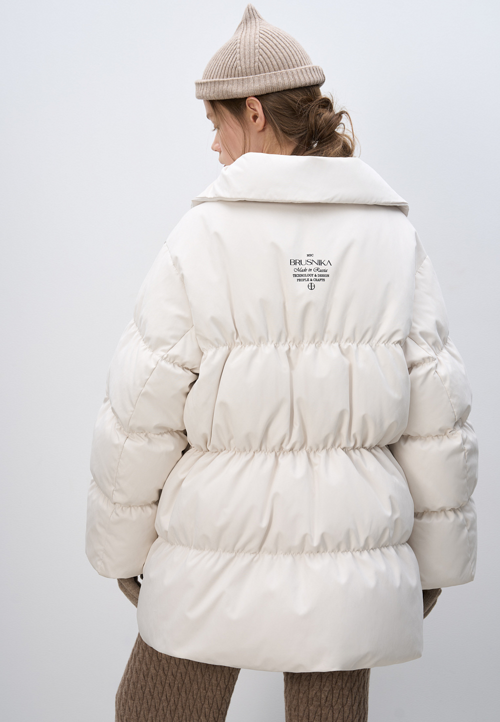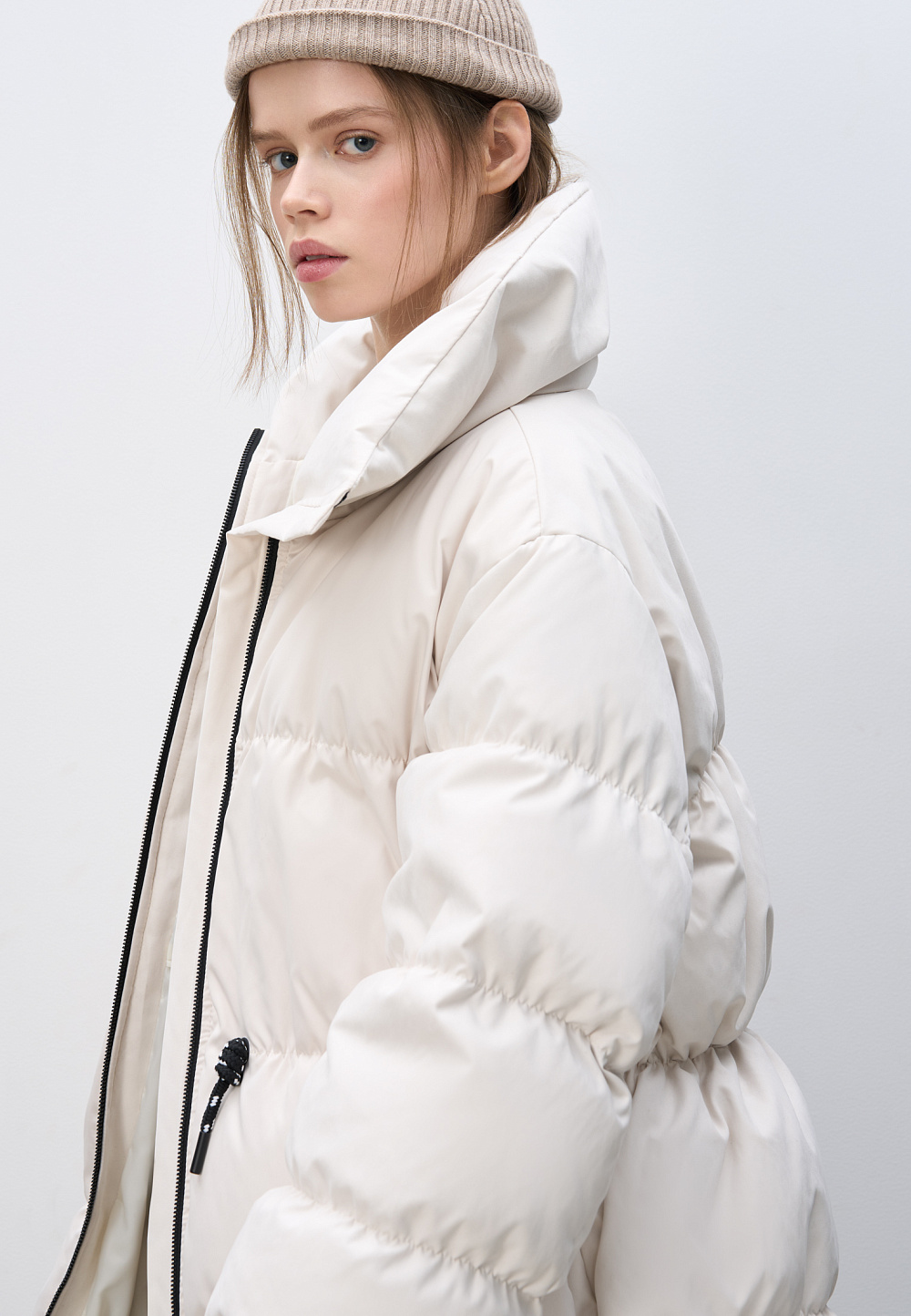 Quilted oversized down jacket. Relaxed silhouette with a stand-up collar, drawstring at the waist and brand logo on the back. Zip closure.