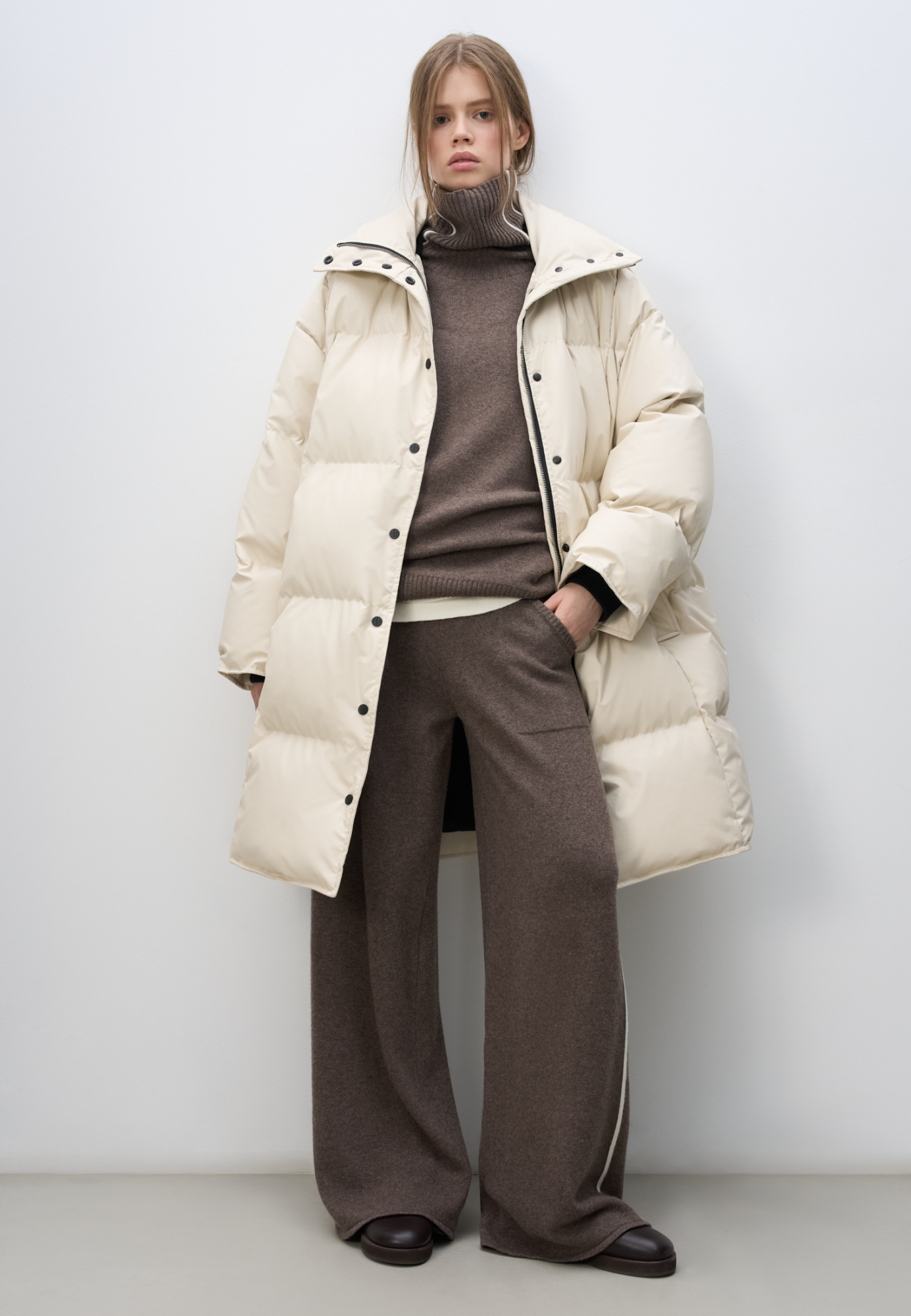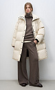 Long down jacket with a stand-up collar and a hood with a drawstring. Straight-fit model with knitted cuffs and side pockets. Zip fastening under the placket with buttons. Branded stitching on the back.