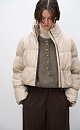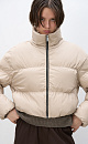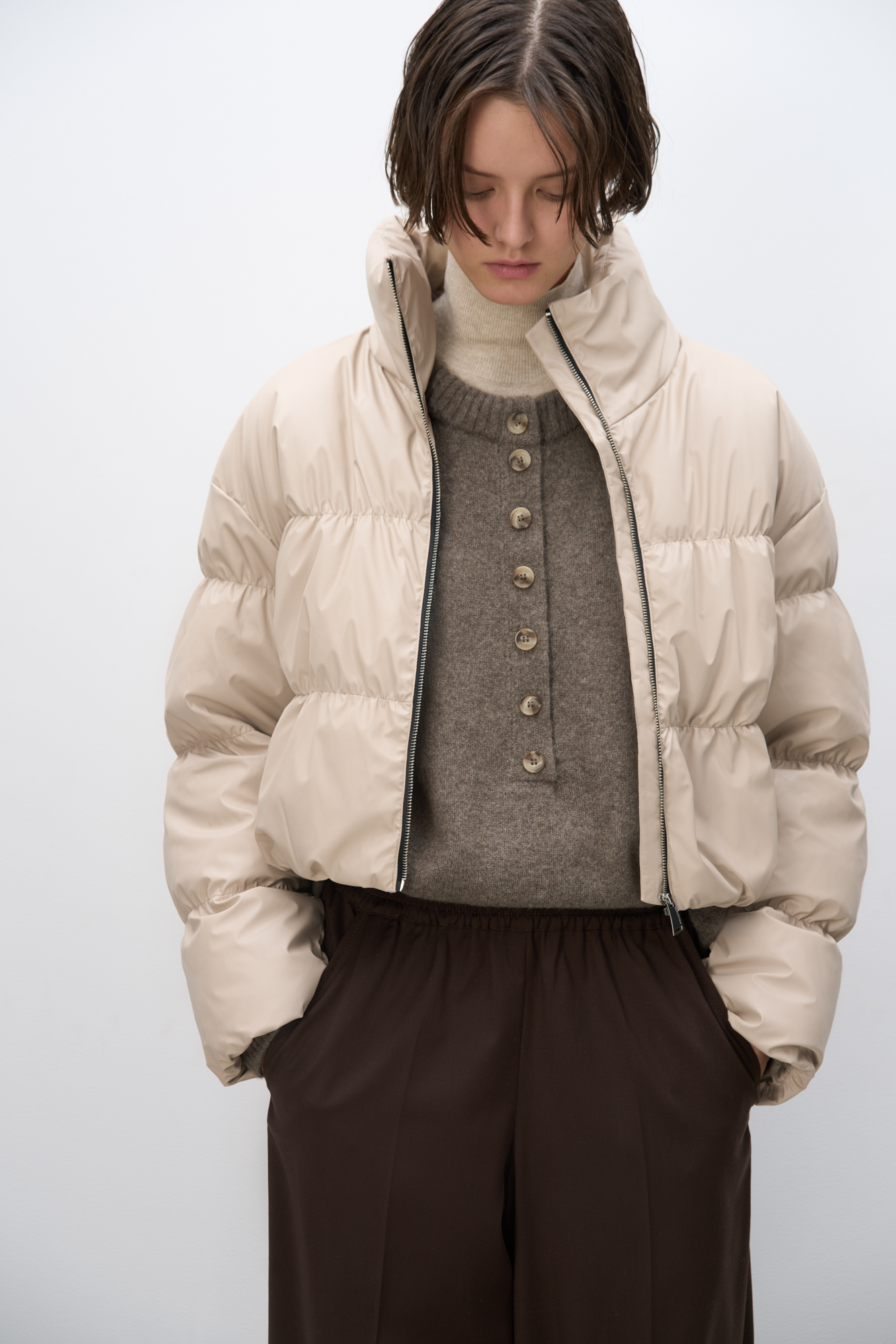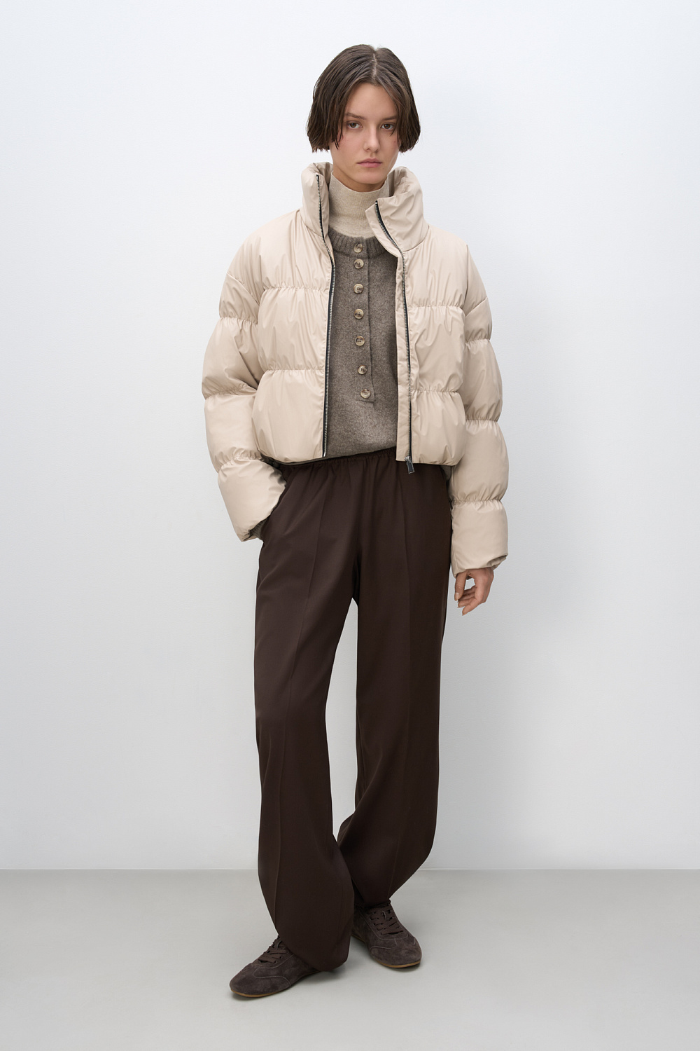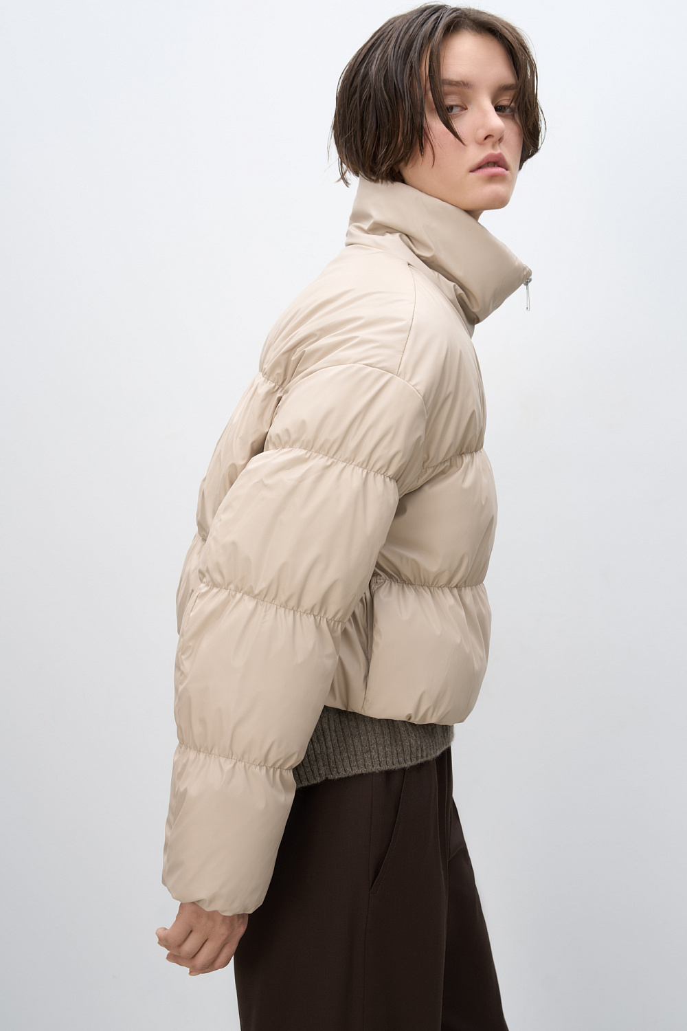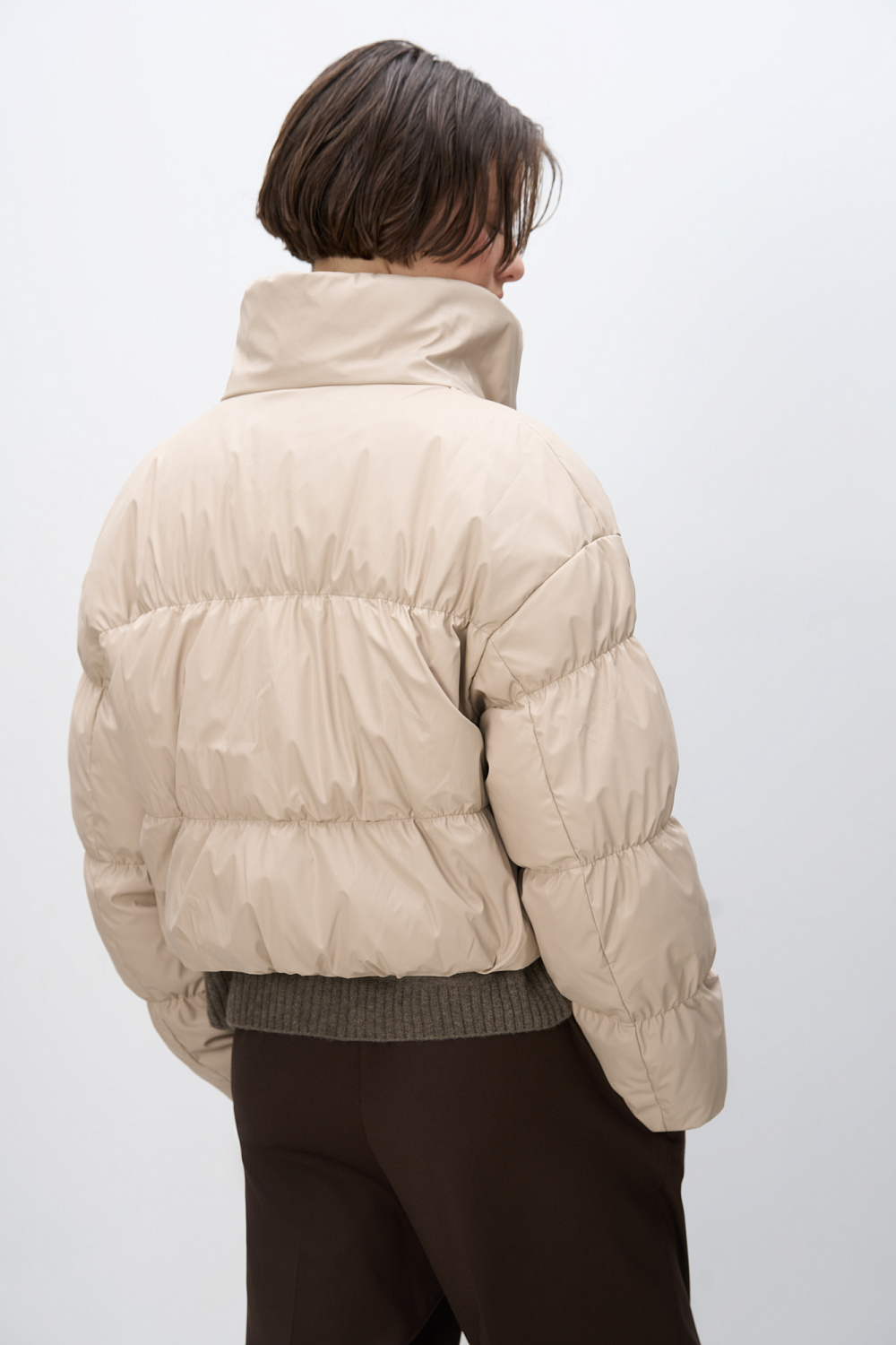 Short quilted down jacket. Loose fit model with stand-up collar and zip fastening.