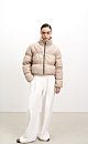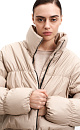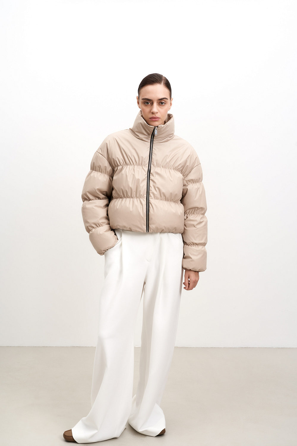 Short faux leather puffer jacket. Stand-up collar, front zip closure.