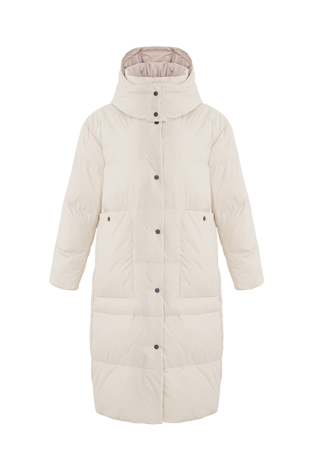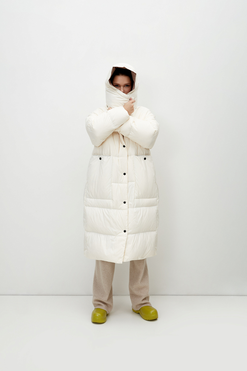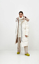 Long hooded down jacket. Average water resistance, can be worn in dry weather or drizzling rain.