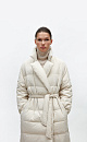 Double-sided down jacket with a belt. With horizontal stitching on one side. Average water resistance, can be worn in dry weather or drizzling rain.