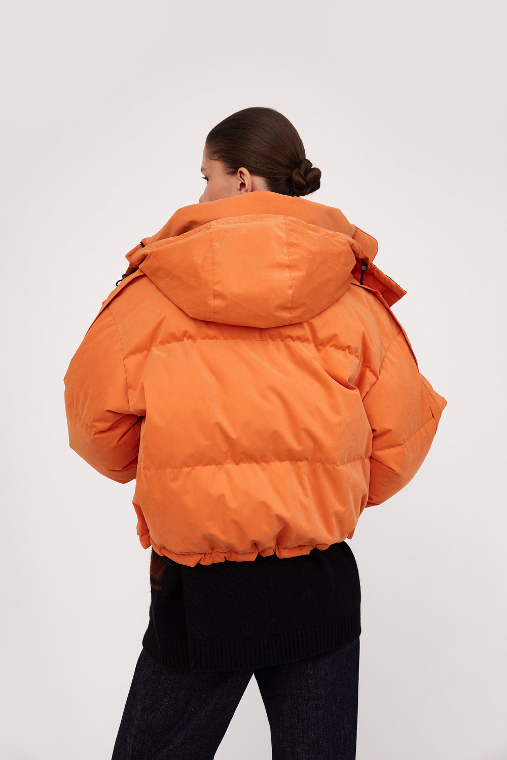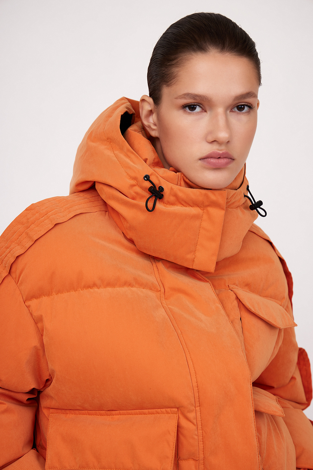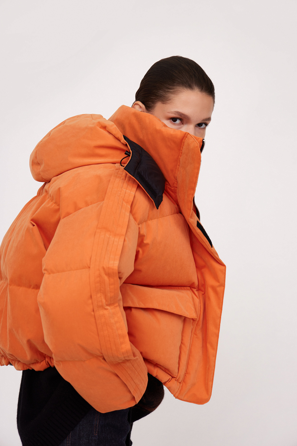 Short oversized puffer jacket with zip and velcro fasteners and high collar. Filling: down-feather. Voluminous hood, drawstringand with a cord stoppers at the hem. One chest pocket and two side pockets with flaps. Highly waterproof, withstands light rain and sleet.