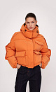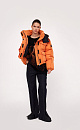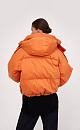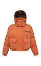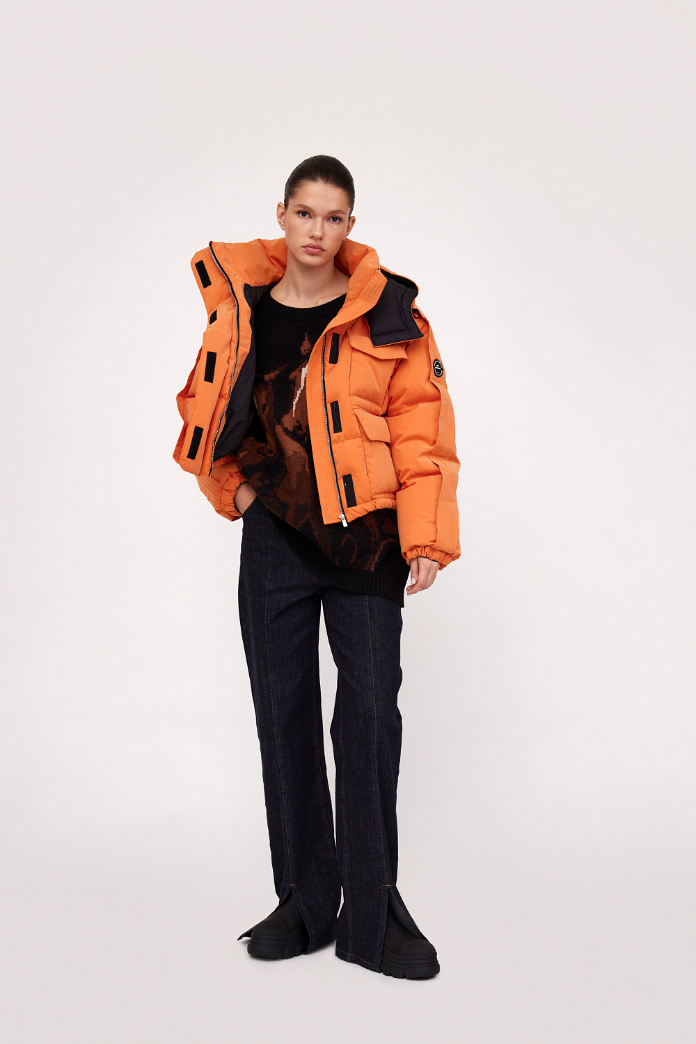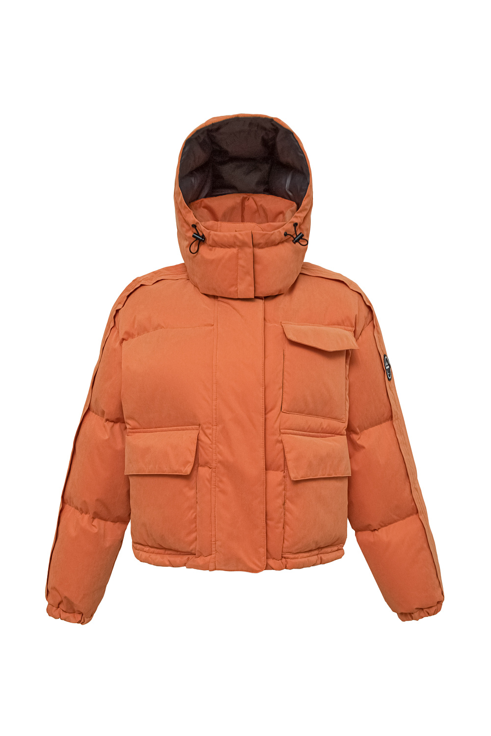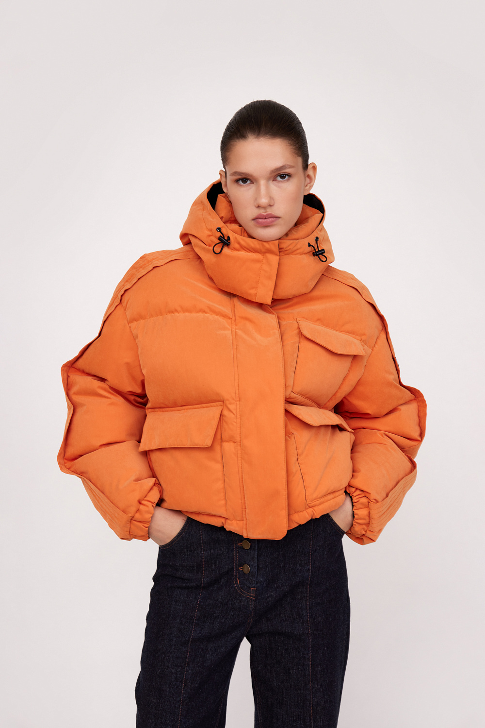 Short oversized puffer jacket with zip and velcro fasteners and high collar. Filling: down-feather. Voluminous hood, drawstringand with a cord stoppers at the hem. One chest pocket and two side pockets with flaps. Highly waterproof, withstands light rain and sleet.