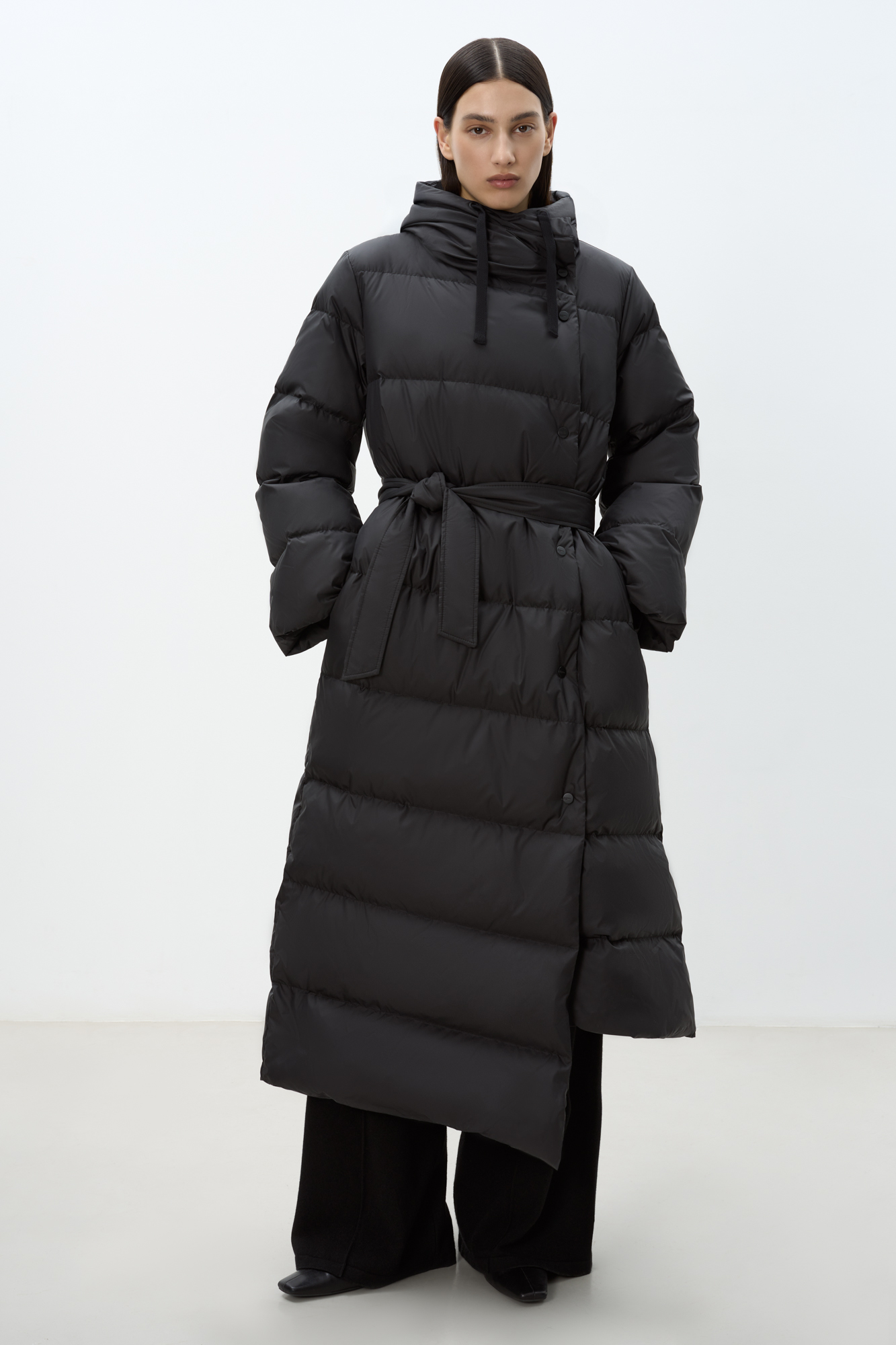 One of the longest and warmest down jackets in the collection will allow you to wear your favorite things even in cold weather. Thick raincoat fabric protects from the wind, and selected down filling protects heat. Self-belt included. Average water resistance, can be worn in dry weather or drizzling rain.