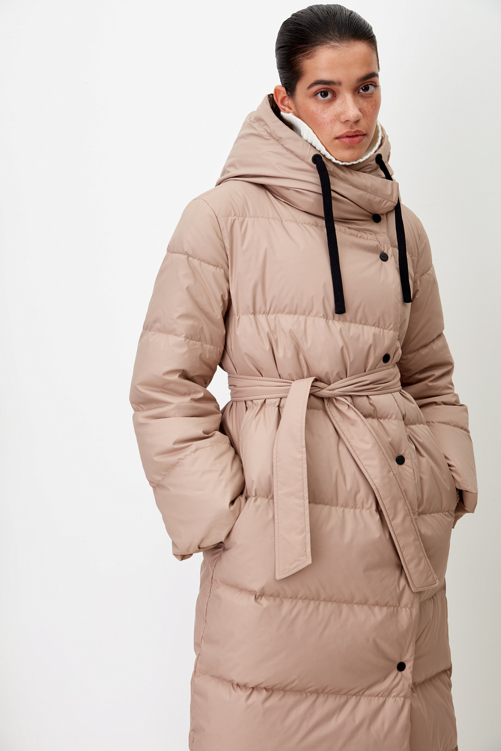 One of the longest and warmest down jackets in the collection will allow you to wear your favorite things even in cold weather. Thick raincoat fabric protects from the wind, and selected down filling protects heat. Self-belt included. Average water resistance, can be worn in dry weather or drizzling rain.