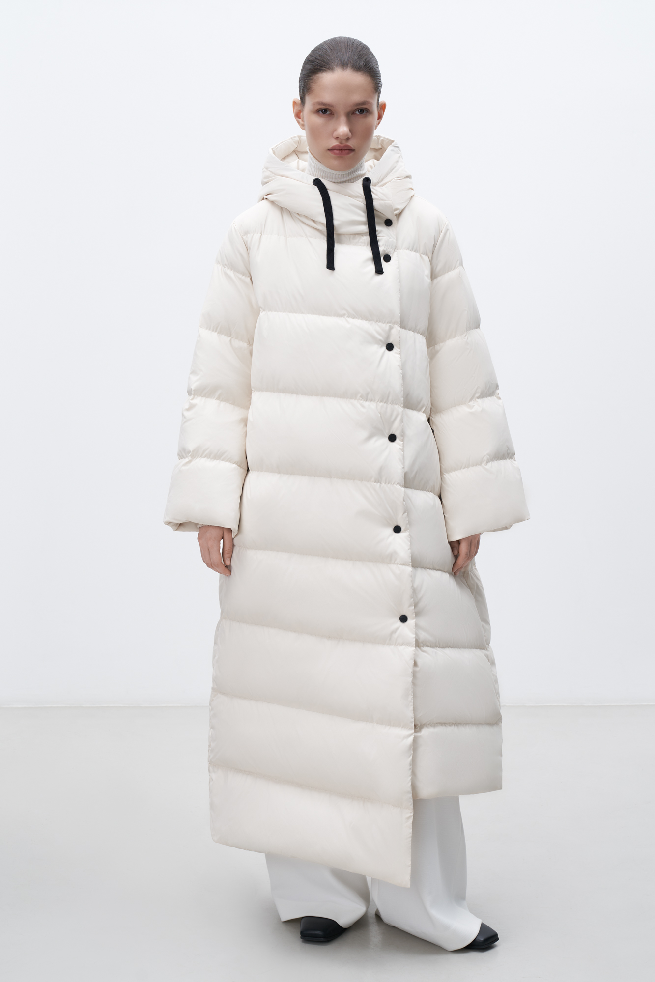One of the longest and warmest down jackets in the collection will allow you to wear your favorite things even in cold weather. Thick raincoat fabric protects from the wind, and selected down filling protects heat. Self-belt included. Average water resistance, can be worn in dry weather or drizzling rain.