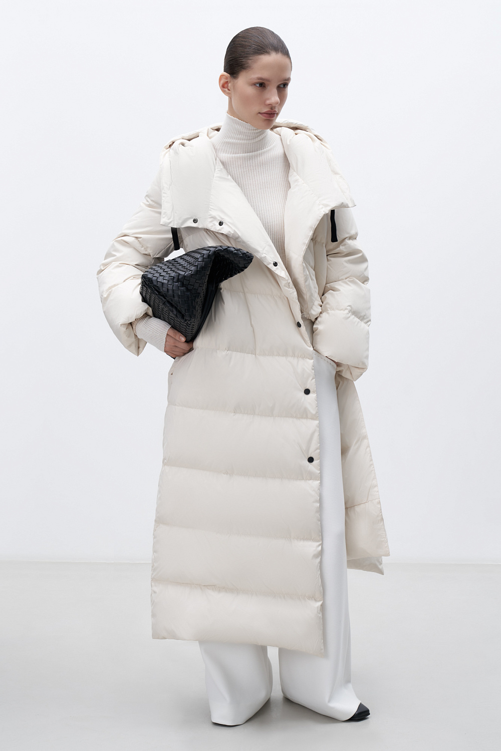One of the longest and warmest down jackets in the collection will allow you to wear your favorite things even in cold weather. Thick raincoat fabric protects from the wind, and selected down filling protects heat. Self-belt included. Average water resistance, can be worn in dry weather or drizzling rain.