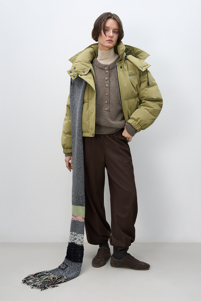 Down jacket with a stand-up collar and zippered hood