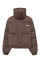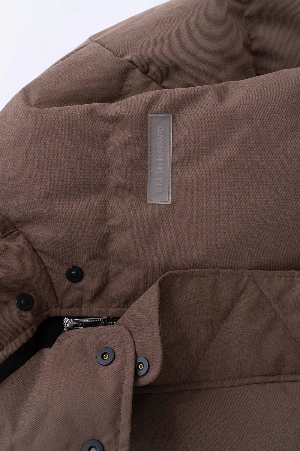 Insulated down jacket with a stand-up collar and zippered hood. Relaxed silhouette, side pockets and a dropped shoulders. Concealed zipper and snap button closure. Filling: natural down 90% feather 10%.