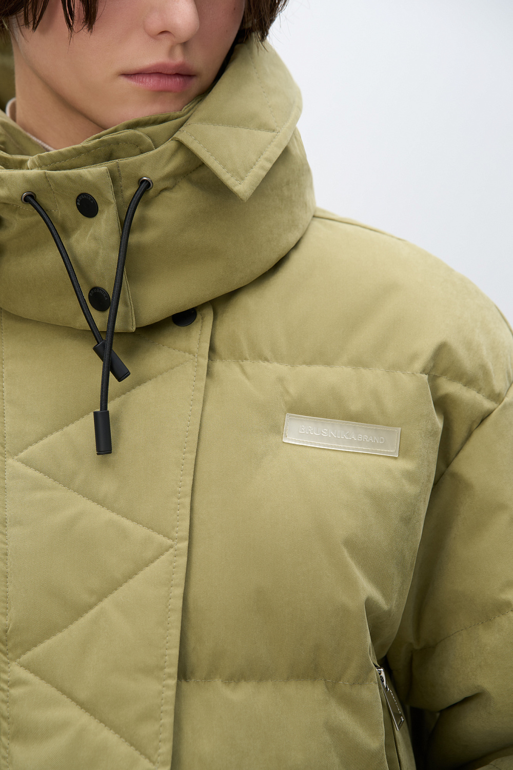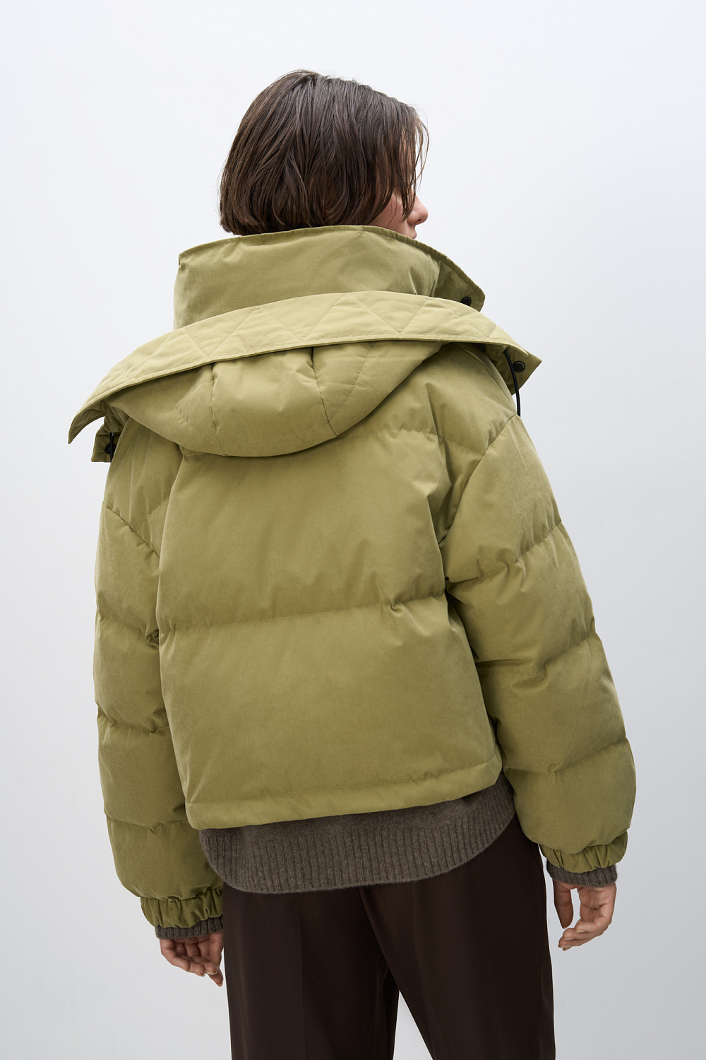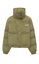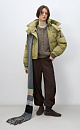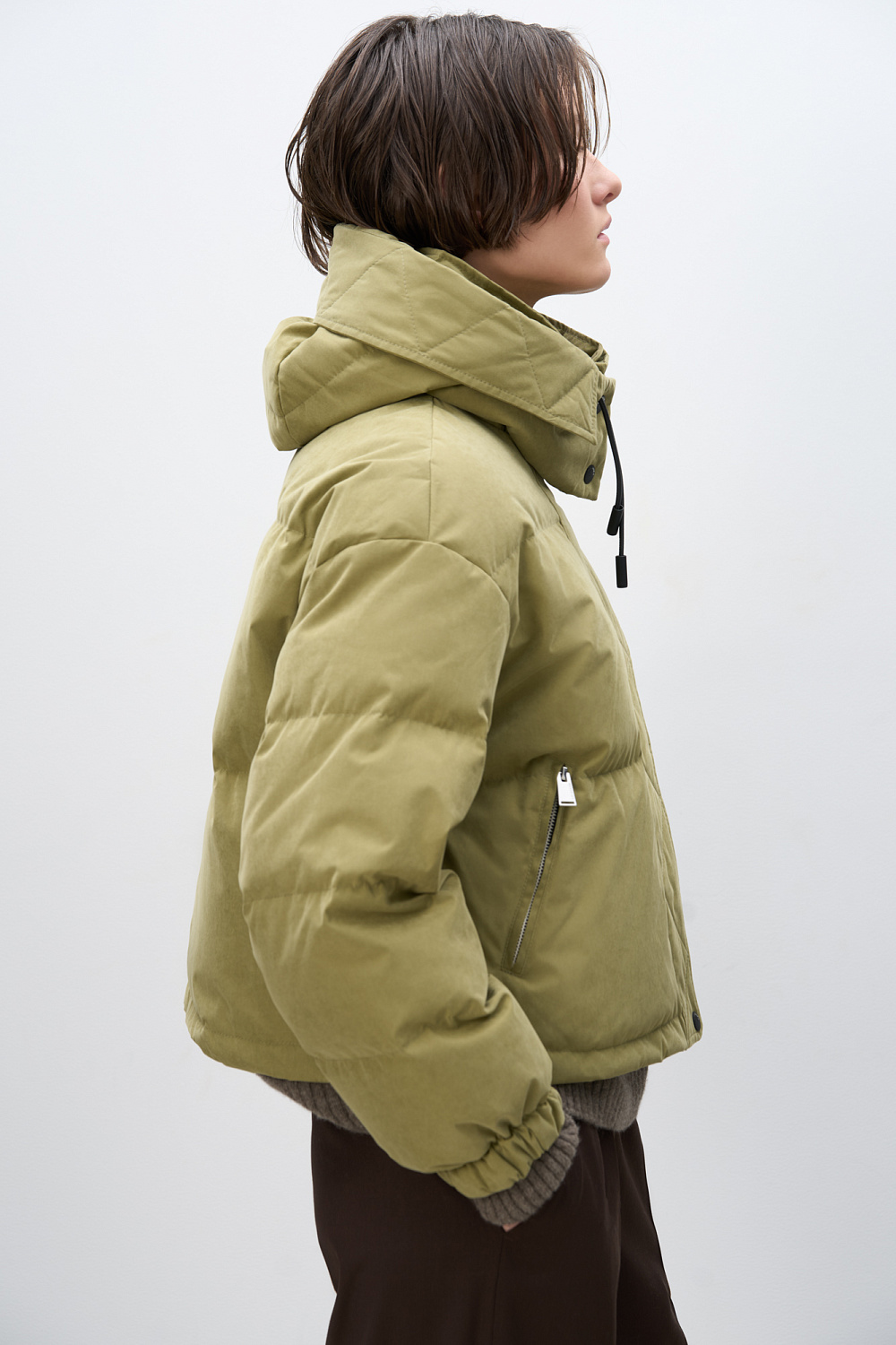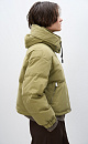 Insulated down jacket with a stand-up collar and zippered hood. Relaxed silhouette, side pockets and a dropped shoulders. Concealed zipper and snap button closure. Filling: natural down 90% feather 10%.