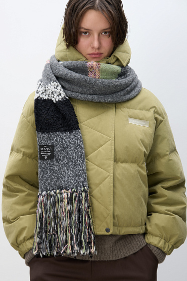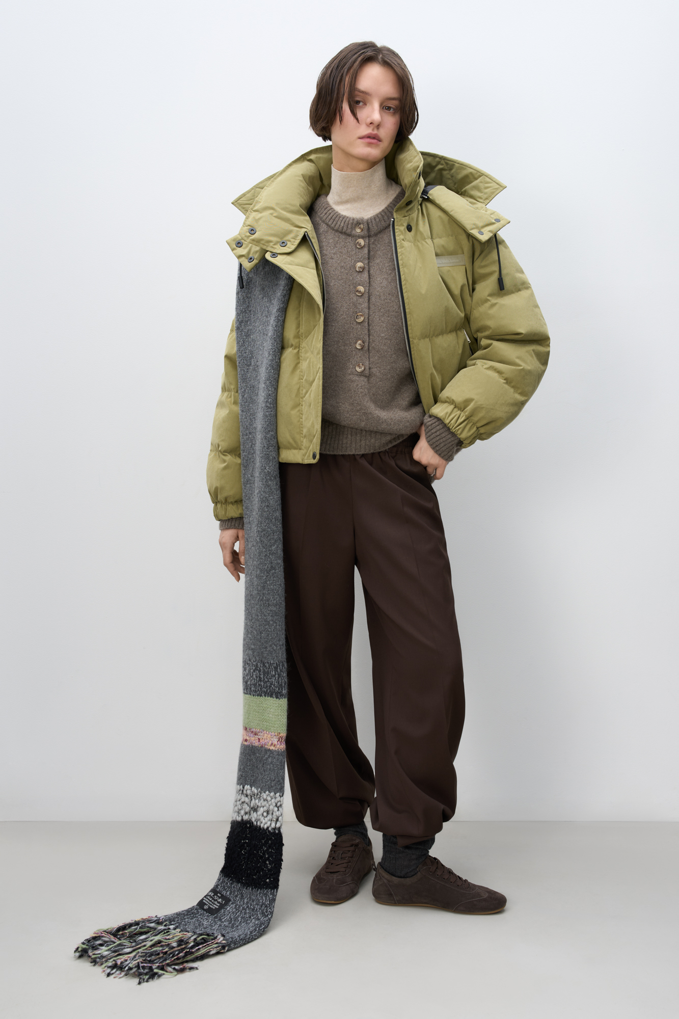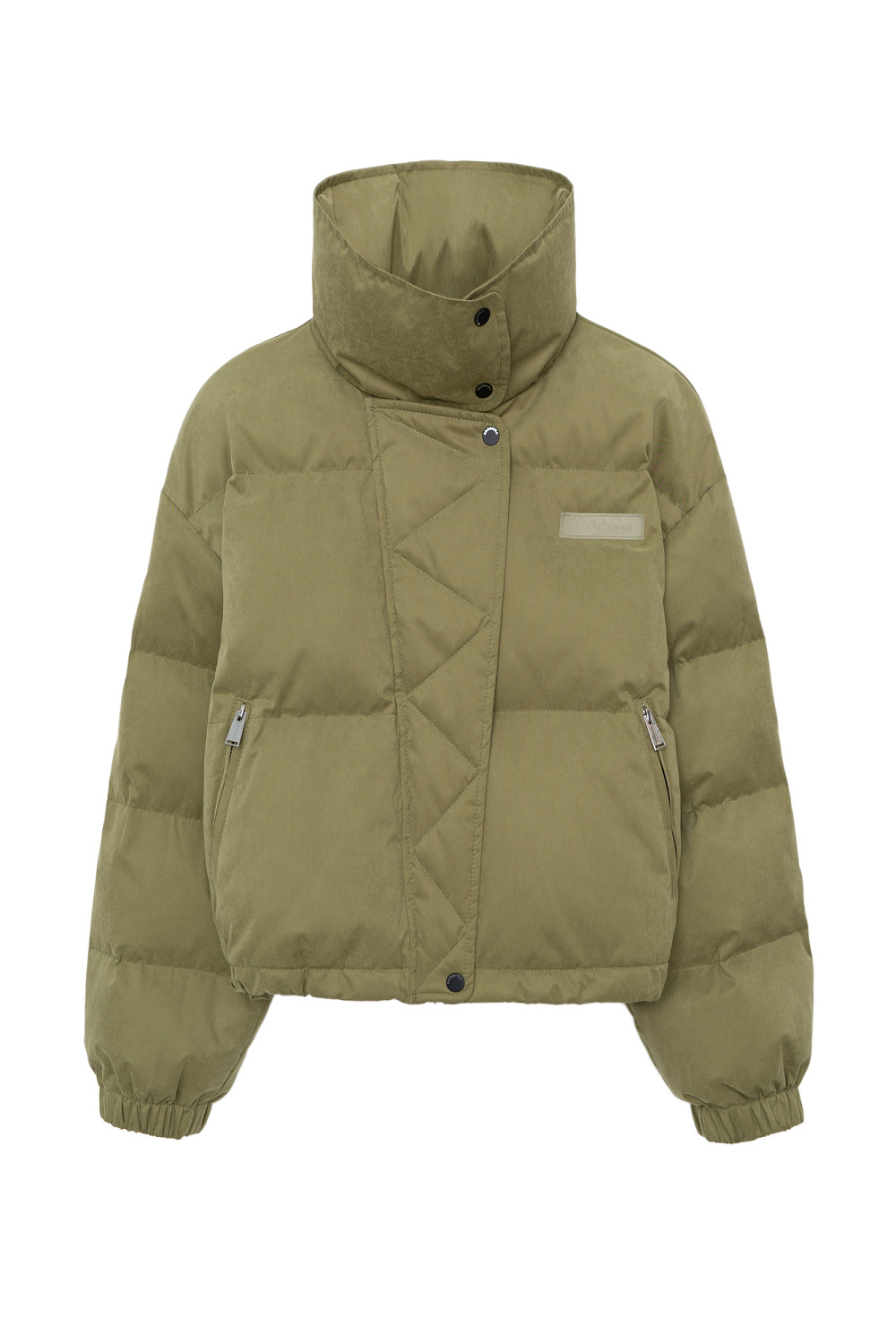 Insulated down jacket with a stand-up collar and zippered hood. Relaxed silhouette, side pockets and a dropped shoulders. Concealed zipper and snap button closure. Filling: natural down 90% feather 10%.