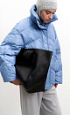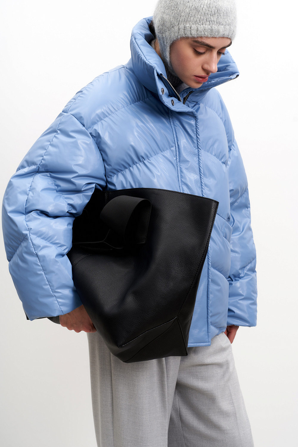 Oversized down jacket with a high collar. Concealed zipper and snap button closure. Side welt pockets. Natural filling: down 90%, feather 10%.