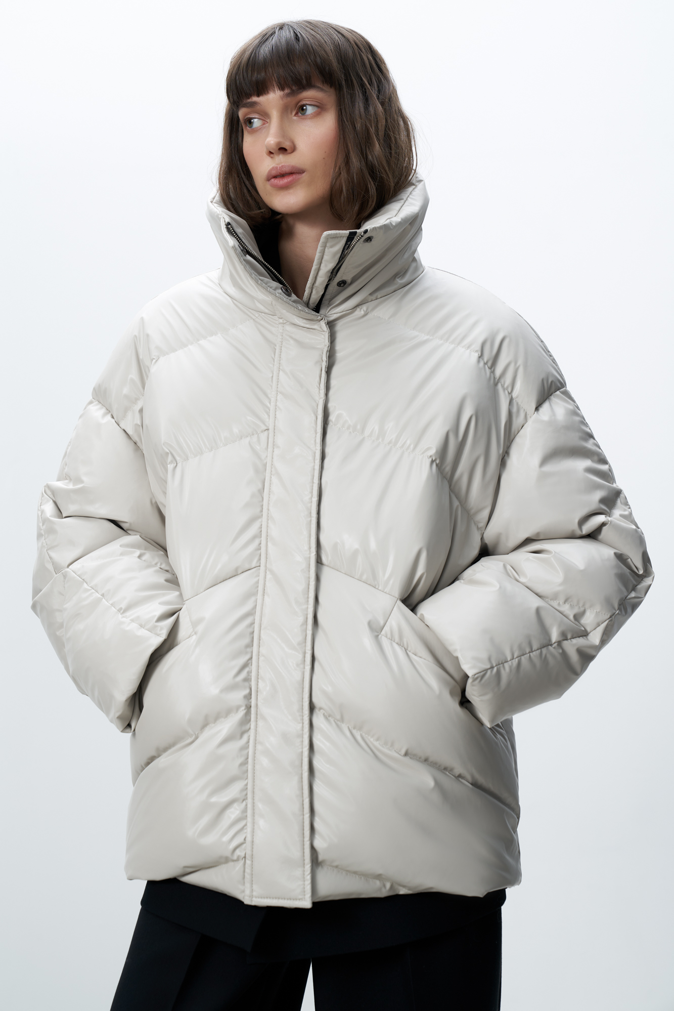 Oversized down jacket with a high collar. Concealed zipper and snap button closure. Side welt pockets. Natural filling: down 90%, feather 10%.