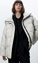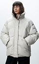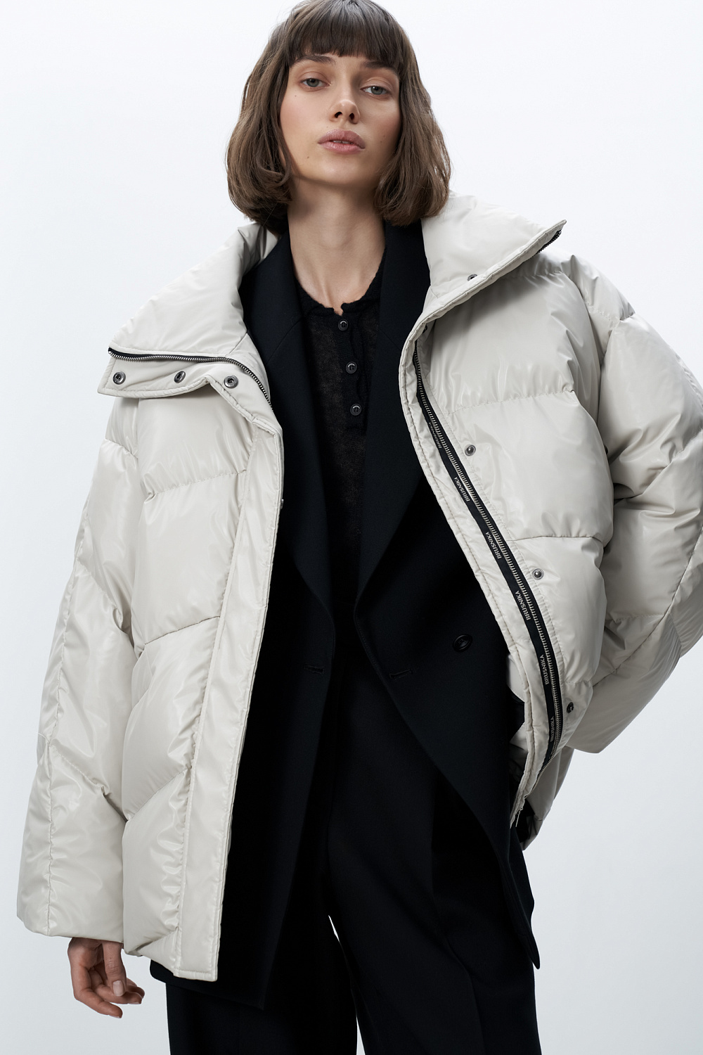 Oversized down jacket with a high collar. Concealed zipper and snap button closure. Side welt pockets. Natural filling: down 90%, feather 10%.