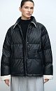 Insulated faux leather down jacket. Features loose silhouette with side pockets and a stand-up collar. Concealed zipper and snap button closure. Lined.