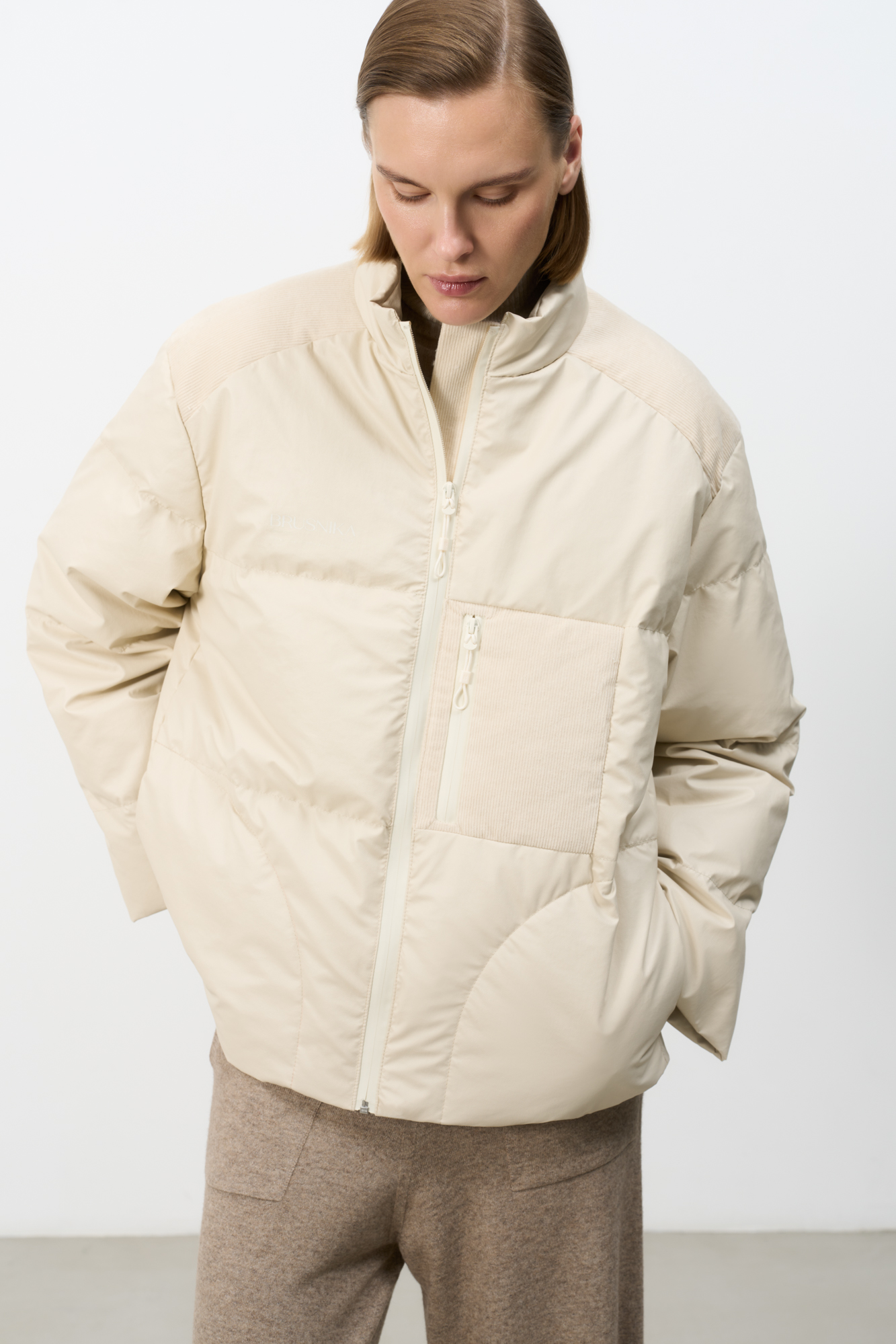 A loose-fitting down jacket with dropped shoulders, a zip pocket and decorative corduroy elements. Zip closure. Lined.