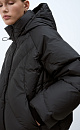 Down jacket with adjustable drawstring at the edges. Loose silhouette model with a stand-up collar, hood and elasticated cuffs. The hood and bottom of the product have a drawstring. Lined. Zip closure.