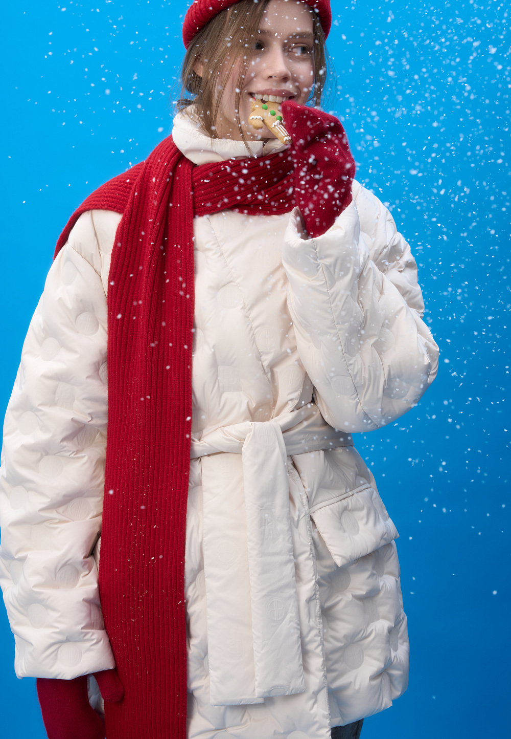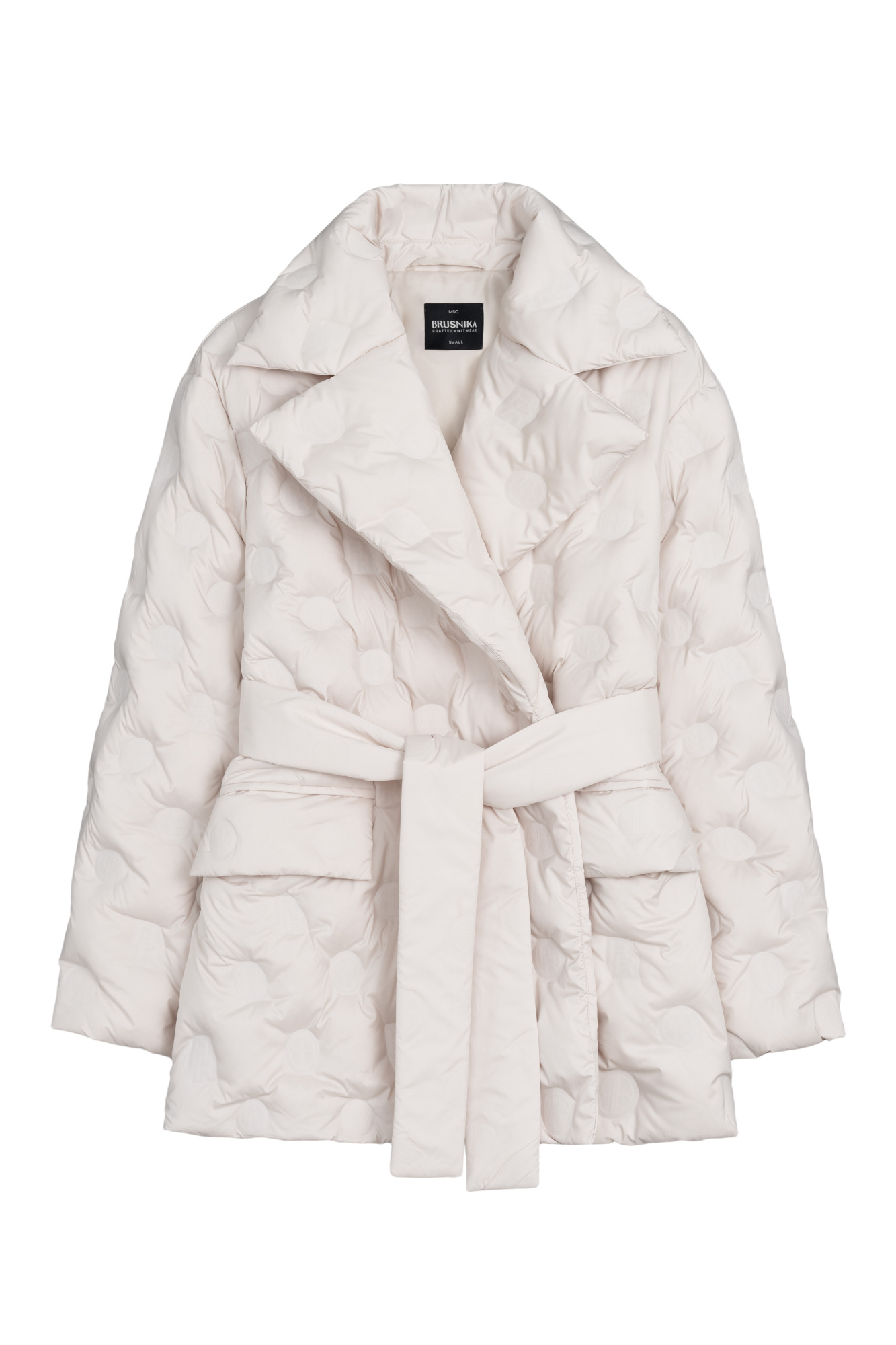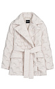Insulated down jacket with a wraparound feel. Loose silhouette model with front pockets and matching belt. The product is decorated with branded embossing. Lined.
