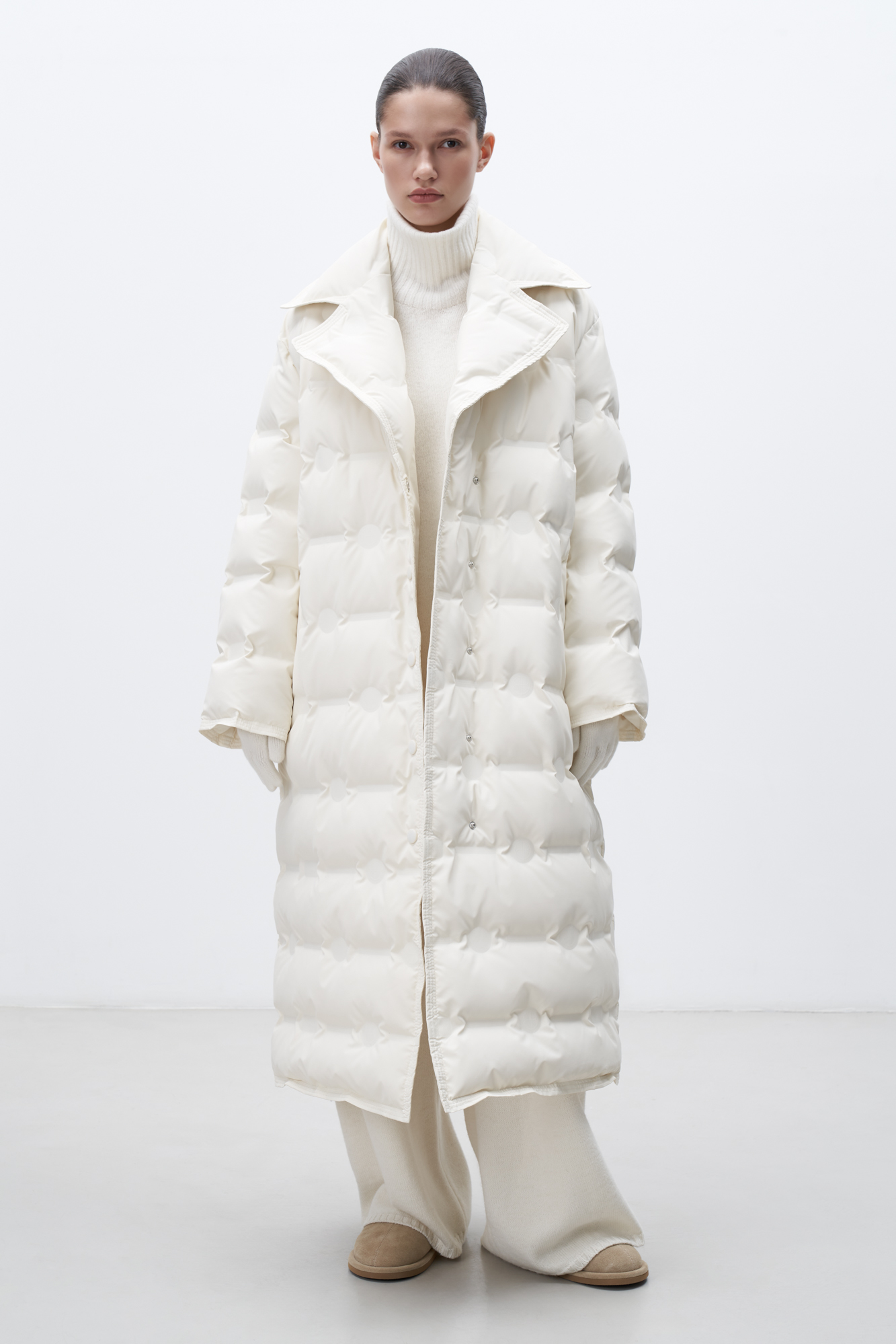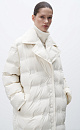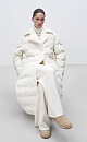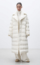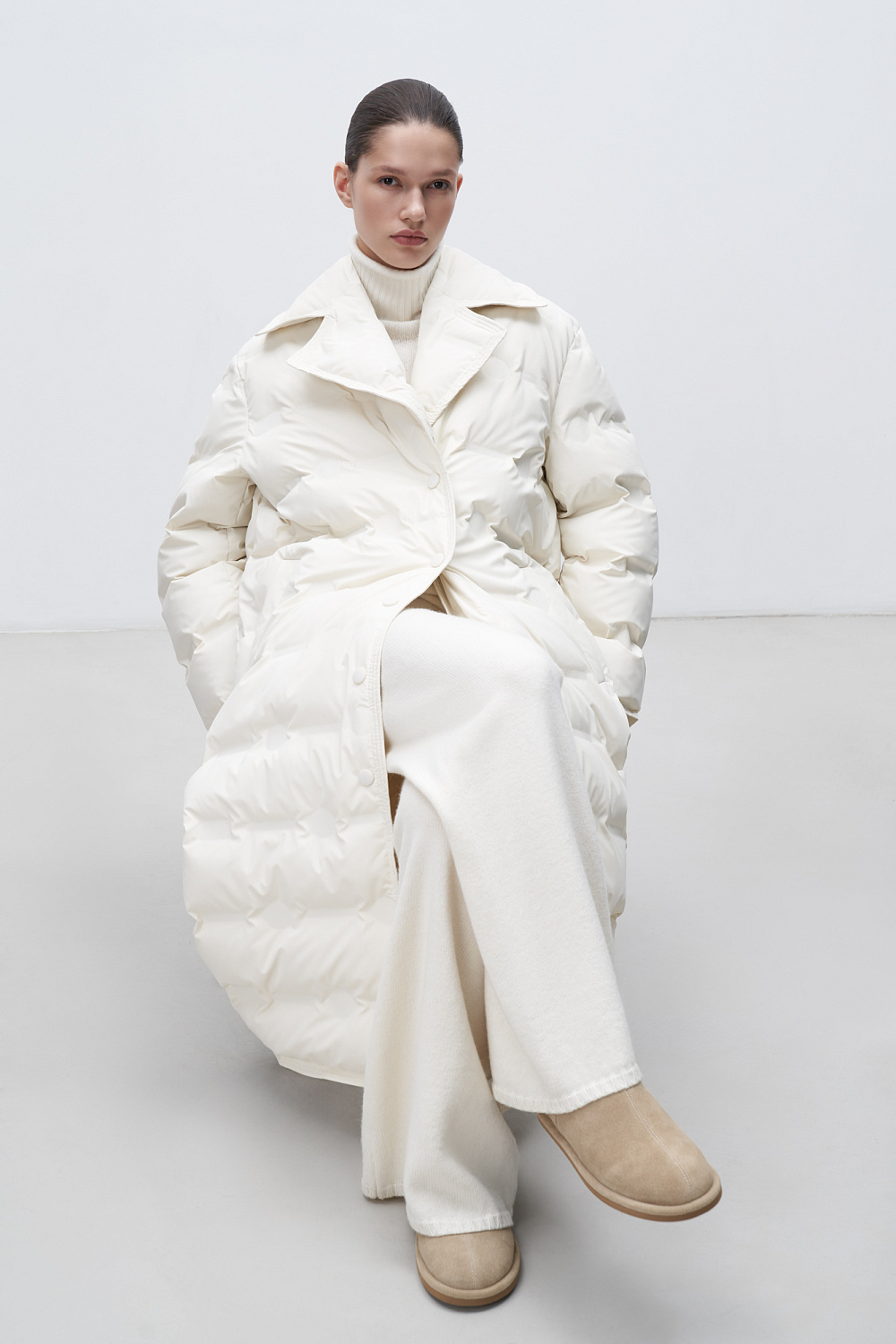 Long down jacket with branded embossing. Loose silhouette model with a wide turn-down collar without a hood. Button closure. The product is lined.