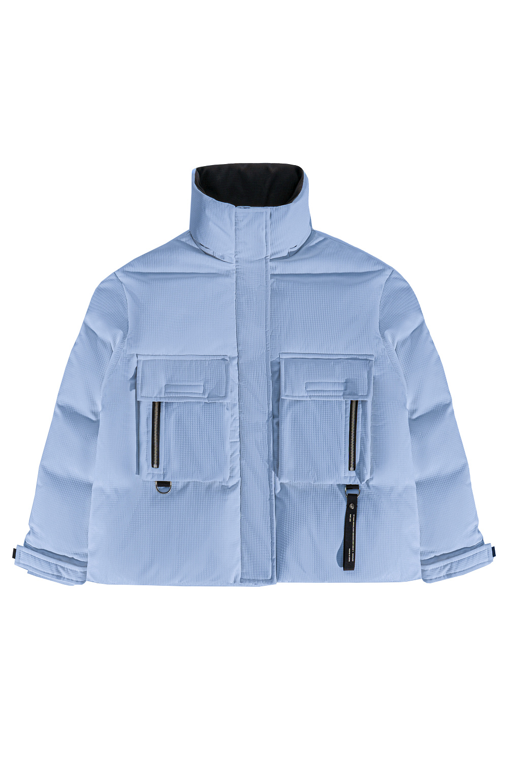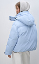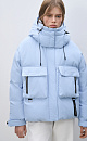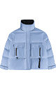 Down jacket with two chest patch pockets, a stand-up collar and a hood. Zip fastening under the placket. The sleeve cuffs are secured with Velcro. The bottom of the product is made with an adjustable drawstring.