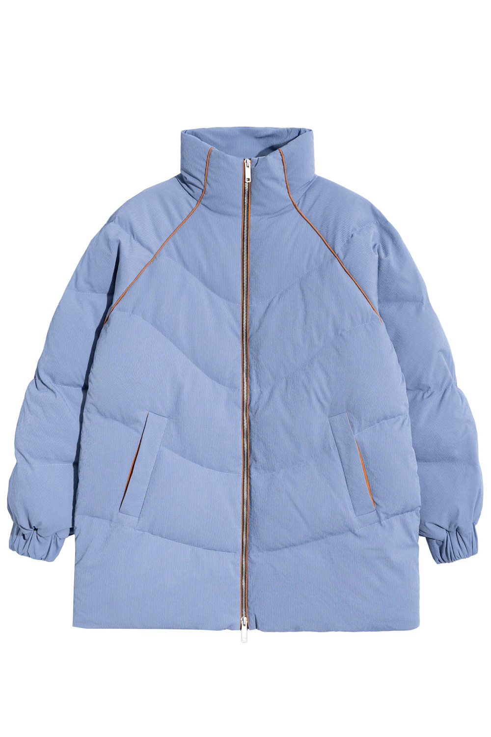 Long quilted down jacket in textured nylon. Model with a stand-up collar and welt pockets. Zip closure. Branded label on the back and sleeve of the product.