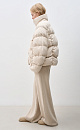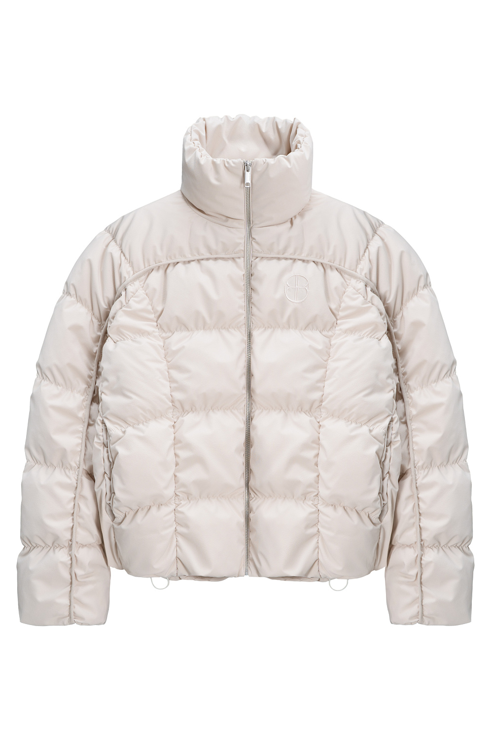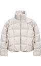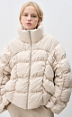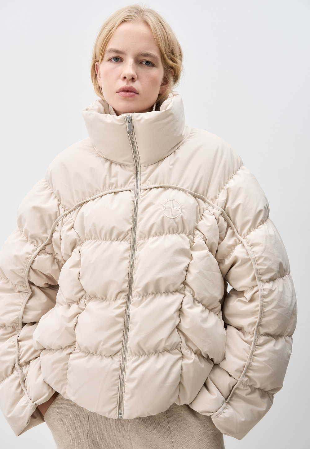 Quilted down jacket with a stand-up collar. Zip closure. The bottom of the product is made with an adjustable drawstring. Embroidered logo on chest. Lined.
